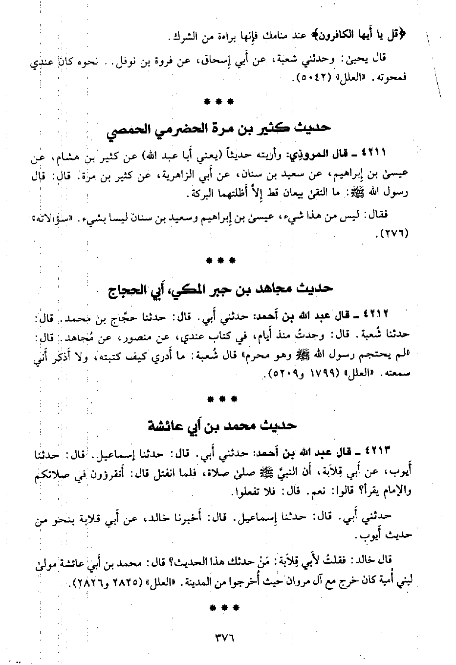 4212 - قال عبد الله بن أحمد: حدثني أبي. قال: حدثنا حجاج بن محمد. قال: حدثنا شعبة. قال: وجدت منذ أيام، في كتاب عندي، عن منصور، عن مجاهد. قال: «لم يحتجم رسول الله - صلى الله عليه وسلم - وهو محرم» قال شعبه: ما أدري كيف كتبته، ولا أذكر أني سَمِعتُهُ. «العلل» (1799 و5209) .