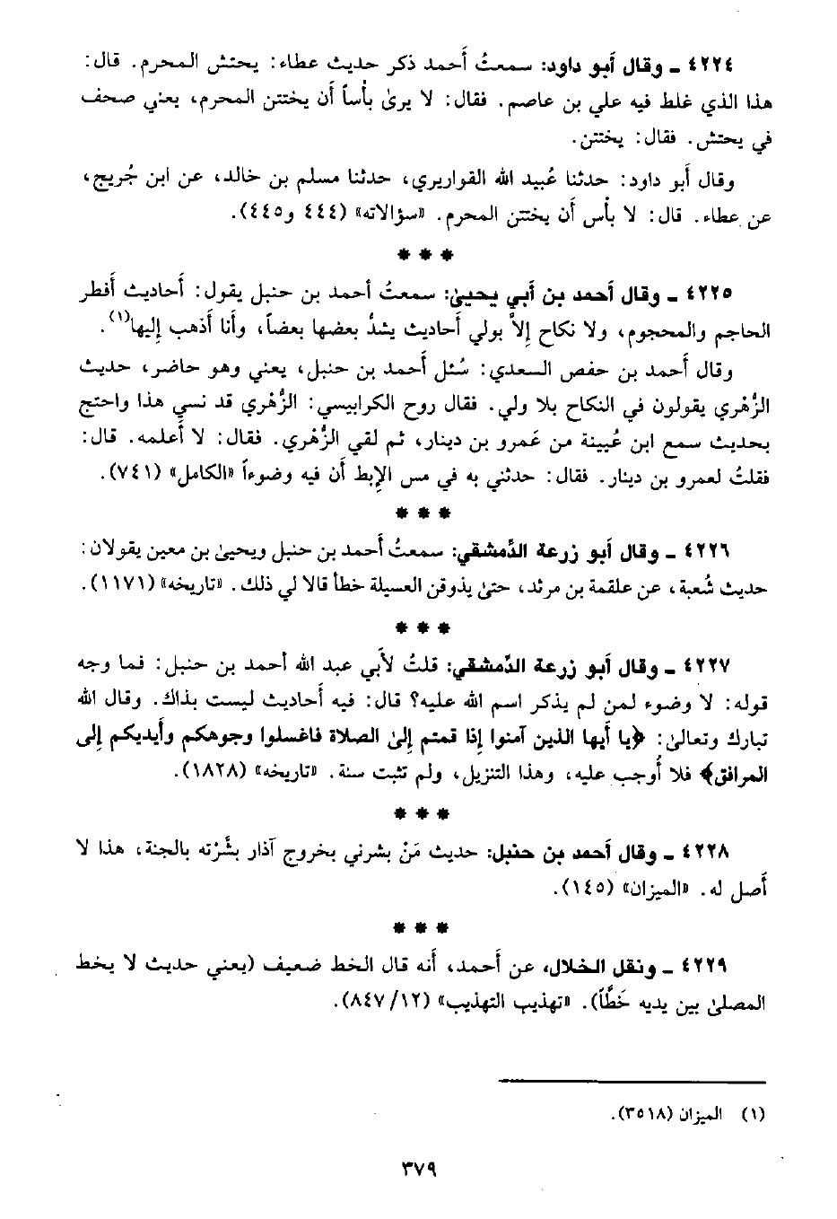 4224 - وقال أبو داود: سمعت أحمد ذكر حديث عطاء: يحتش المحرم. قال: هذا الذي غلط فيه علي بن عاصم. فقال: لا يرى بأسًا أن يختتن المحرم، يعني صحف في يحتش. فقال: يختتن.