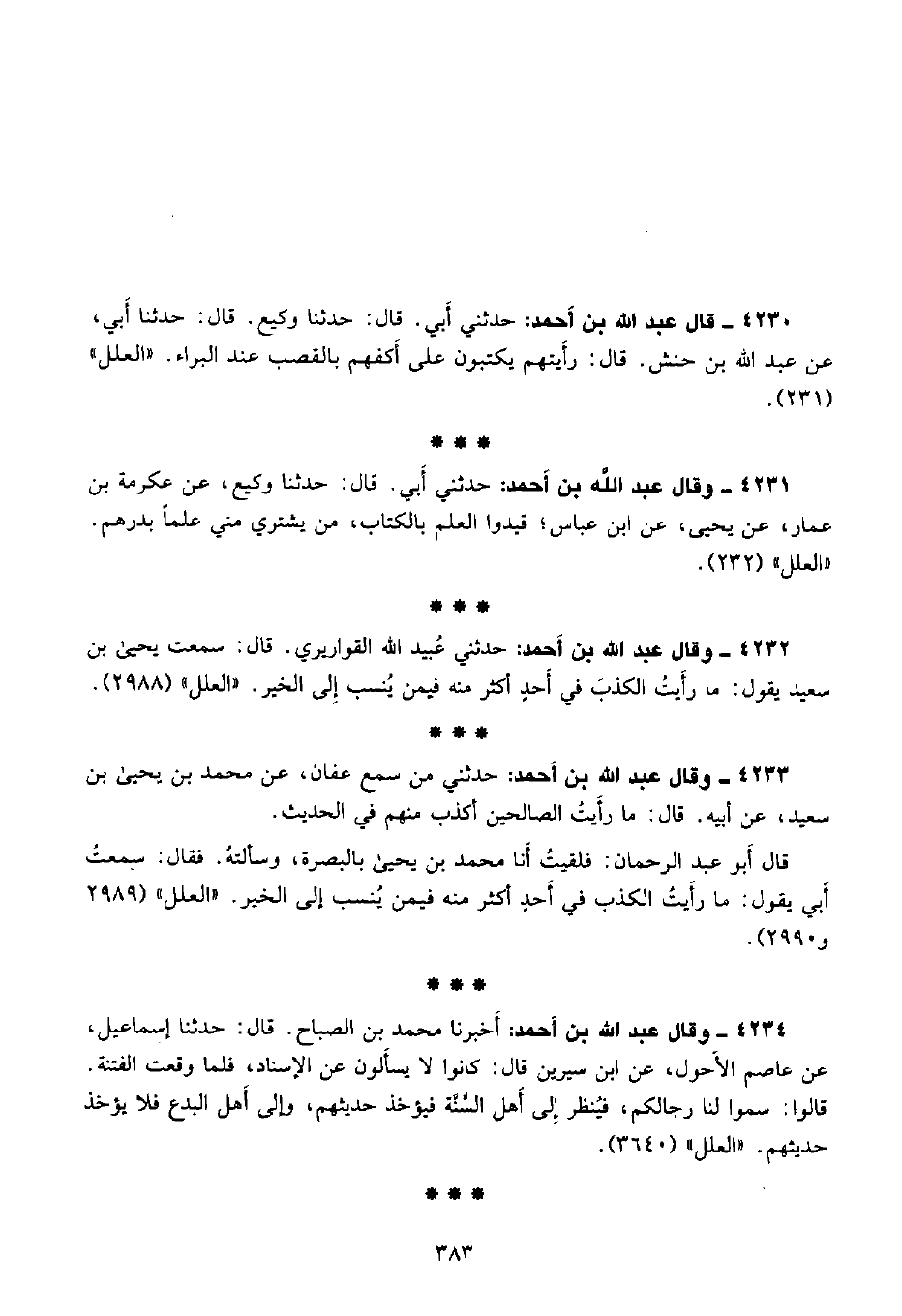 4231 - وقال عبد الله بن أحمد: حدثني أبي. قال: حدثنا وكيع، عن عكرمة بن عمار، عن يحيى، عن ابن عباس؛ قيدوا العلم بالكتاب، من يشتري مني علمًا بدرهم. «العلل» (232) .