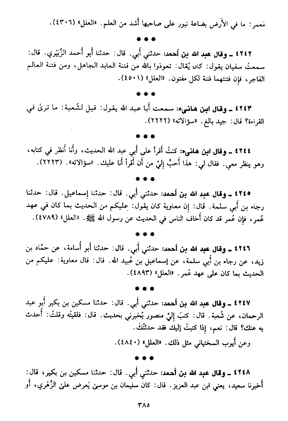 4245 - وقال عبد الله بن أحمد: حدثني أبي. قال: حدثنا إسماعيل. قال: حدثنا رجاء بن أبي سلمة. قال: أن معاوية كان يقول: عليكم من الحديث بما كان في عهد عمر، فإن عمر قد كان أخاف الناس في الحديث عن رسول الله - صلى الله عليه وسلم -. «العلل» (4789) .