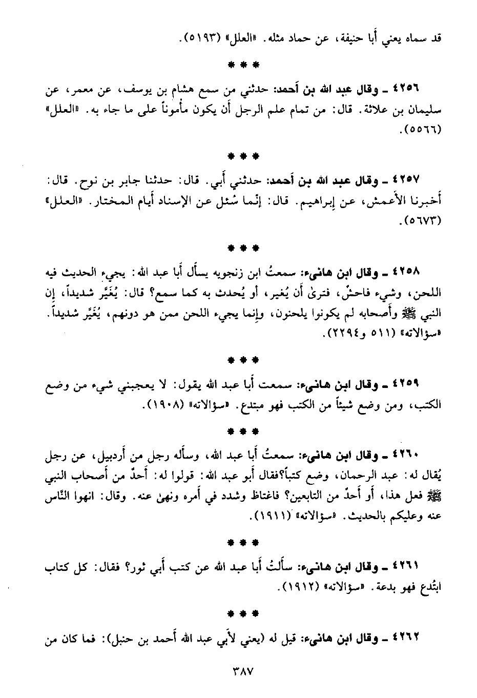 4259 - وقال ابن هانىء: سمعت أبا عبد الله يقول: لا يعجبني شيء من وضع الكتب، ومن وضع شيئًا من الكتب فهو مبتدع. «سؤالاته» (1908) .
