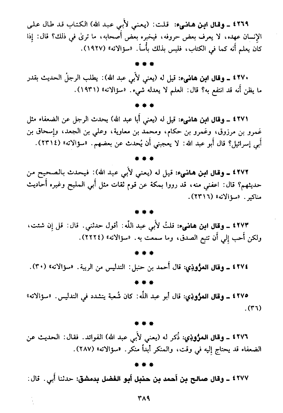 4270 - وقال ابن هانىء: قيل له (يعني لأبي عبد الله) : يطلب الرجل الحديث بقدر ما يظن أنه قد انتفع به. قال: العلم لا يعدله شيء. «سؤالاته» (1931) .