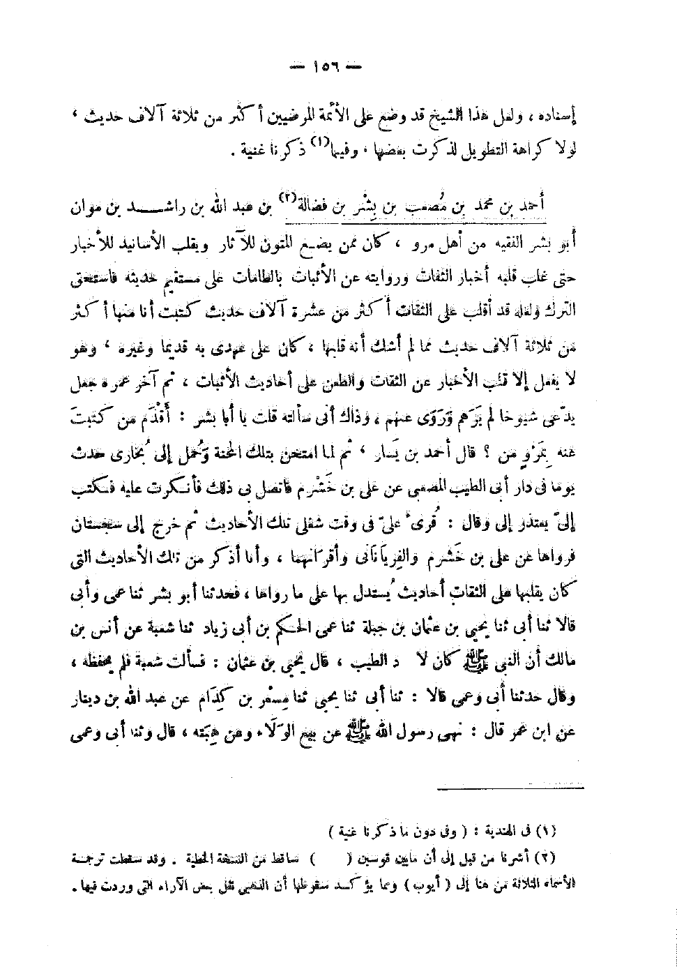 90 - أَحْمَد بْن مُحَمَّد بْن مُصْعَب بْن بشر بْن فضَالة بْن عَبْد اللَّهِ بْن رَاشد بْن موان أَبُو بشر الْفَقِيه من أهل مرو كَانَ مِمَّن يضع الْمُتُون للآثار ويقلب الْأَسَانِيد للْأَخْبَار حَتَّى غلب قلبه أَخْبَار الثفات وَرِوَايَته عَن الْأَثْبَات بالطامات عَلَى مُسْتَقِيم حَدِيثه فَاسْتحقَّ التّرْك وَلَعَلَّه قَدْ أقلب عَلَى الثِّقَات أَكْثَر من عشرَة آلَاف حَدِيث كتبت أَنا مِنْهَا أَكْثَر من ثَلَاثَة آلَاف حَدِيث مِمَّا لَمْ أَشك أَنَّهُ قَلبهَا كَانَ عَلَى عهدي بِهِ قَدِيما وَغَيره وَهُوَ لَا يفعل إِلَّا قلب الْأَخْبَار عَن الثِّقَات والطعن عَلَى أَحَادِيث الْأَثْبَات ثُمَّ آخر عمره جعل يدعى شُيُوخًا لَمْ يرهم وَروى عَنْهُم وَذَاكَ أَنِّي سَأَلته قُلْت يَا أَبَا بشر أقدم من كتبت عَنْهُ بمرو من قَالَ أَحْمَد بْن يسَار ثُمَّ لما امتحن بِتِلْكَ المحنة وَحمل إِلَى بُخَارى حدث يَوْمًا فِي دَار أَبِي الطّيب المصعبي عَن عَلِي بْن خشرم فاتصل بِي ذَلِكَ فأنكرت عَلَيْهِ فَكتب إِلَيّ يعْتَذر إِلَيّ وَقَالَ قرئَ عَلَي فِي وَقت شغلي تِلْكَ الْأَحَادِيث ثُمَّ خرج إِلَى سجستان فرواها عَن عَلِي بْن خشرم والفرياناني وأقرانهما وَأَنا أذكر من تِلْكَ الْأَحَادِيث الَّتِي كَانَ يقلبها عَلَى الثِّقَات أَحَادِيث يسْتَدلّ بِهَا عَلَى مَا رَوَاهَا فَحَدَّثَنَا أَبُو بِشْرٍ ثَنَا عَمِّي وَأَبِي قَالا ثَنَا أَبِي ثَنَا يَحْيَى بْنُ عُثْمَانَ بْنِ جَبَلَةَ ثَنَا عَمِّي الْحَكَمُ بْنُ أَبِي زِيَادٍ ثَنَا شُعْبَةُ عَنْ أَنَسِ بْنِ مَالِكٍ أَنَّ النَّبِيَّ صَلَّى اللَّهُ عَلَيْهِ وَسَلَّمَ كَانَ لَا يَرُدُّ الطِّيبَ قَالَ يَحْيَى بْنُ عُثْمَانَ فَسَأَلْتُ شُعْبَةَ فَلَمْ يَحْفَظْهُ وَقَالَ حَدثنِي أَبِي وَعَمِّي قَالا ثَنَا أَبِي ثَنَا يَحْيَى ثَنَا مِسْعَرُ بْنُ كِدَامٍ عَنْ عَبْدِ اللَّهِ بْنِ دِينَار عَن بن عُمَرَ قَالَ نَهَى رَسُولُ اللَّهِ صَلَّى اللَّهُ عَلَيْهِ وَسَلَّمَ عَنْ بَيْعِ الْوَلاءِ وَعَنْ هِبَتِهِ قَالَ وثنا أبي وعمى