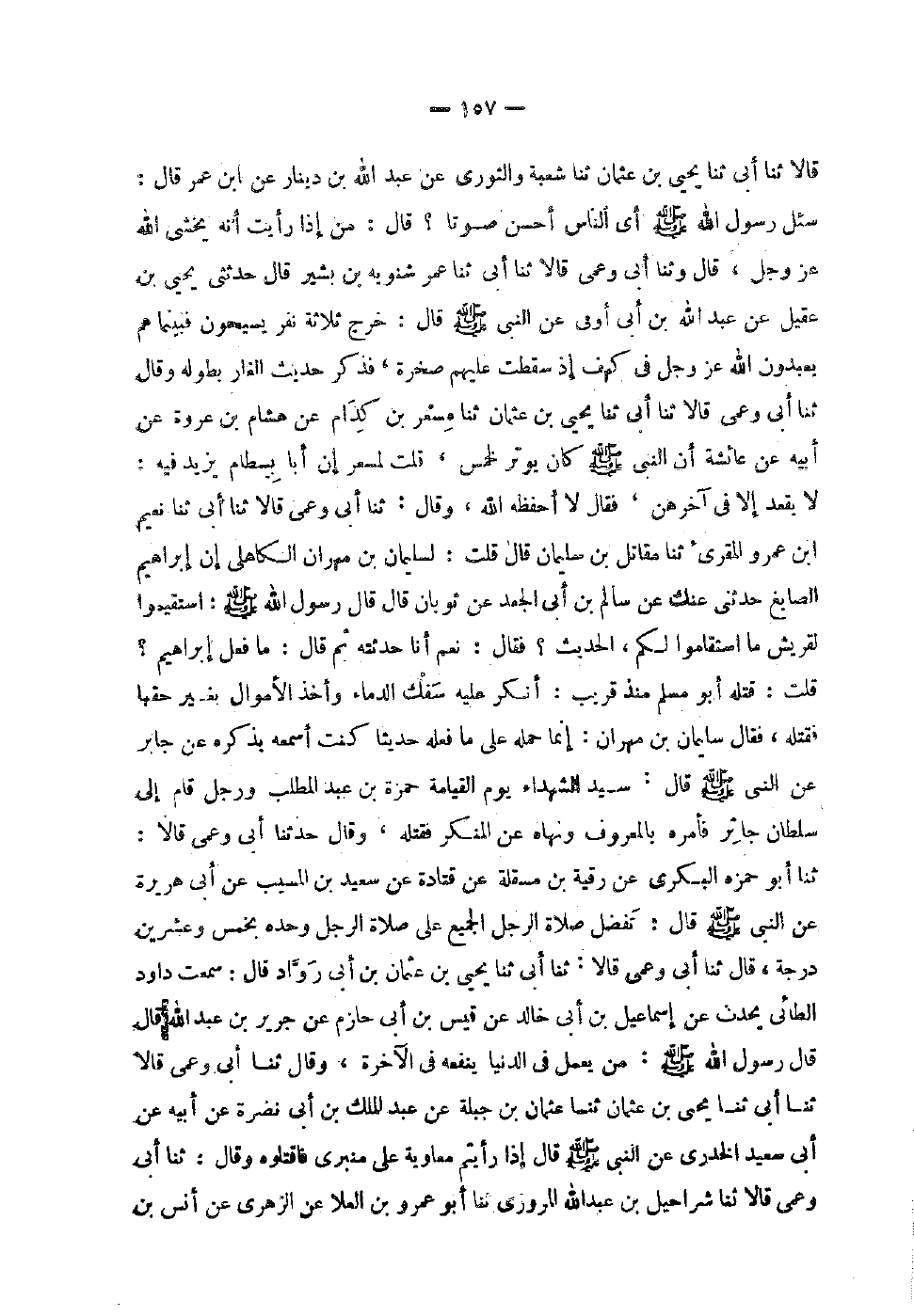 قَالا ثَنَا أَبِي ثَنَا يَحْيَى بْنُ عُثْمَانَ ثَنَا شُعْبَةُ وَالثَّوْرِيُّ عَنْ عَبْدِ اللَّهِ بْنِ دِينَارٍ عَن بن عُمَرَ قَالَ سُئِلَ رَسُولُ اللَّهِ صَلَّى اللَّهُ عَلَيْهِ وَسَلَّمَ أَيُّ النَّاسِ أَحْسَنُ صَوْتًا قَالَ مَنْ إِذَا رَأَيْتُ أَنَّهُ يَخْشَى اللَّهُ عَزَّ وَجَلَّ قَالَ وَثنا أَبِي وَعَمِّي قَالا ثَنَا أَبِي ثَنَا عُمَرُ شنويه بْنُ بَشِيرٍ قَالَ حَدَّثَنِي يَحْيَى بْنُ عُقَيْلٍ عَنْ عَبْدِ اللَّهِ بْنِ أَبِي أَوْفَى عَن النَّبِي صَلَّى اللَّهُ عَلَيْهِ وَسَلَّمَ قَالَ خَرَجَ ثَلاثَةُ نَفَرٍ يَسِيحُونَ فَبَيْنَمَا هُمْ يَعْبُدُونَ اللَّهَ عز وَجل فِي كَهْف إِذا سَقَطَتْ عَلَيْهِم صَخْرَةٌ فَذَكَرَ حَدِيثَ الْغَارِ بِطُولِهِ وَقَالَ ثَنَا أَبِي وَعَمِّي قَالا ثَنَا أَبِي ثَنَا يَحْيَى بْنُ عُثْمَانَ ثَنَا مِسْعَرُ بْنُ كِدُامٍ عَنْ هِشَامِ بْنِ عُرْوَةَ عَنْ أَبِيهِ عَنْ عَائِشَةَ أَن النَّبِي صَلَّى اللَّهُ عَلَيْهِ وَسَلَّمَ كَانَ يُوتِرُ لِخَمْسٍ قُلْتُ لِمِسْعَرٍ إِنَّ أَبَا بَسْطَامَ يَزِيدُ فِيهِ لَا يَقْعُدُ إِلا فِي آخِرِهِنَّ فَقَالَ لَا أَحْفَظَهُ اللَّهُ وَقَالَ ثَنَا أَبِي وَعَمِّي قَالا ثَنَا أَبِي ثَنَا نُعَيْمُ بْنُ عَمْرٍو الْمُقْرِئُ ثَنَا مُقَاتِلُ بْنُ سُلَيْمَانَ قَالَ قُلْتُ لِسُلَيْمَانَ بْنِ مِهْرَانَ الْكَاهِلِيِّ إِنَّ إِبْرَاهِيمَ الصَّايِغَ حَدَّثَنِي عَنْكَ عَنْ سَالِمِ بْنِ أَبِي الْجَعْدِ عَنْ ثَوْبَانَ قَالَ قَالَ رَسُولُ اللَّهِ صَلَّى اللَّهُ عَلَيْهِ وَسَلَّمَ اسْتَقِيمُوا لِقُرَيْشٍ مَا ستقاموا لَكُمْ الْحَدِيثَ فَقَالَ نَعَمْ أَنَا حَدَّثْتُهُ ثُمَّ قَالَ مَا فَعَلَ إِبْرَاهِيمُ قُلْتُ قَتَلَهُ أَبُو مُسْلِمٍ مُنْذُ قَرِيبٍ أَنْكَرَ عَلَيْهِ سَفْكَ الدِّمَاءِ وَأَخْذَ الأَمْوَالِ بِغَيْرِ حَقِّهَا فَقَتَلَهُ فَقَالَ سُلَيْمَانُ بْنُ مِهْرَانَ إِنَّمَا حمله على مافعله حَدِيثًا كُنْتُ أَسْمَعُهُ يَذْكُرُهُ عَنْ جَابِرٍ عَنِ النَّبِيِّ صَلَّى اللَّهُ عَلَيْهِ وَسَلَّمَ قَالَ سَيِّدُ الشُّهَدَاءِ يَوْمَ الْقِيَامَةِ حَمْزَةُ بْنُ عَبْدِ الْمُطَّلِبِ وَرَجُلٌ قَامَ إِلَى سُلْطَانٍ جَائِرٍ فَأَمَرَهُ بِالْمَعْرُوفِ وَنَهَاهُ عَنِ الْمُنكر فَقتله وَقَالَ حَدثنِي أَبِي وَعَمِّي قَالا ثَنَا أَبُو حَمْزَة الْبكْرِيّ عَن رقية بن مَسْقَلَة عَنْ قَتَادَةَ عَنْ سَعِيدِ بْنِ الْمُسَيِّبِ عَنْ أَبِي هُرَيْرَةَ عَنِ النَّبِي صَلَّى اللَّهُ عَلَيْهِ وَسَلَّمَ قَالَ تَفْضُلُ صَلاةُ الرَّجُلِ الْجَمِيعِ عَلَى صَلاةِ الرَّجُلِ وَحْدَهُ بِخَمْسٍ وَعِشْرِينَ دَرَجَةً قَالَ ثَنَا أَبِي وَعَمِّي قَالا ثَنَا أَبِي ثَنَا يَحْيَى بْنُ عُثْمَانَ بْنِ أَبِي رَوَّادٍ قَالَ سَمِعْتُ دَاوُدَ الطَّائِيَّ يُحَدِّثُ عَنْ إِسْمَاعِيلَ بْنِ أَبِي خَالِدٍ عَنْ قَيْسِ بْنِ أَبِي حَازِمٍ عَنْ جَرِيرِ بْنِ عَبْدِ اللَّهِ قَالَ قَالَ رَسُولُ اللَّهِ صَلَّى اللَّهُ عَلَيْهِ وَسَلَّمَ مَنْ يَعْمَلْ فِي الدُّنْيَا يَنْفَعْهُ فِي الآخِرَةِ وَقَالَ ثَنَا أَبِي وَعَمِّي قَالا ثَنَا أَبِي ثَنَا يَحْيَى بْنُ عُثْمَانَ ثَنَا عُثْمَانُ بْنُ جَبَلَةَ عَنْ عَبْدِ الْمَلِكِ بْنِ أَبِي نَضْرَةَ عَنْ أَبِيهِ عَنْ أَبِي سَعِيدٍ الْخُدْرِيِّ عَنِ النَّبِيِّ صَلَّى اللَّهُ عَلَيْهِ وَسَلَّمَ قَالَ إِذَا رَأَيْتُمْ مُعَاوِيَةَ عَلَى مِنْبَرِي فَاقْتُلُوهُ وَقَالَ ثَنَا أَبِي وَعَمِّي قَالا ثَنَا شَرَاحِيلُ بْنُ عَبْدِ اللَّهِ الْمَرْوَزِيُّ ثَنَا أَبُو عَمْرِو بن الْعلَا عَنِ الزُّهْرِيِّ عَنْ أَنَسِ بْنِ