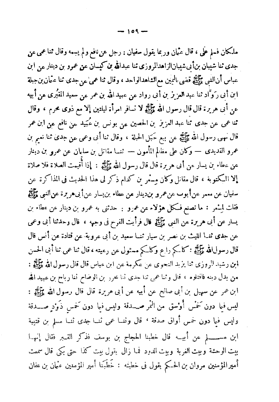 مَلَكَانِ فَسَلَّمَ عَلِيَّ قَالَ عُثْمَانُ وَرُبَّمَا يَقُولُ سُفْيَانُ رَجُلٌ عَنْ نَافِعٍ وَلَمْ يُسَمِّهِ وَقَالَ ثَنَا عَمِّي عَنْ جَدِّي ثَنَا شَيْبَانُ بْنُ أَبِي شَيْبَانَ الزَّاهِدُ الْمَرْوَزِيُّ ثَنَا عَبْدُ اللَّهِ بْنُ كَيْسَانَ عَنْ عَمْرِو بْنِ دِينَارٍ عَنْ بن عَبَّاسٍ أَنَّ النَّبِيَّ صَلَّى اللَّهُ عَلَيْهِ وَسَلَّمَ قَضَى بِالْيَمِينِ مَعَ الشَّاهِدِ الْوَاحِدِ وَقَالَ ثَنَا عَمِّي عَنْ جَدِّي ثَنَا عُثْمَانُ بْنُ جَبَلَةَ بْنِ أَبِي رَوَّادٍ ثَنَا عَبْدِ الْعَزِيزِ بْنِ أَبِي رَوَّادٍ عَن عبيد الله بن عمر عَنْ سَعِيدٍ الْمَقْبُرِيِّ عَنْ أَبِيهِ عَنْ أَبِي هُرَيْرَةَ قَالَ قَالَ رَسُولُ اللَّهِ صَلَّى اللَّهُ عَلَيْهِ وَسَلَّمَ لَا تُسَافِرُ امْرَأَةٌ لَيْلَتَيْنِ إِلا مَعَ ذَوِي مَحْرَمٍ وَقَالَ ثَنَا عَمِّي عَنْ جَدِّي ثَنَا عَبْدُ الْعَزِيزِ بْنُ الْحُصَيْنِ عَنْ يُونُسَ بْنِ عُبَيْدٍ عَنْ نَافِعٍ عَن بن عُمَرَ قَالَ نَهَى رَسُولُ اللَّهِ صَلَّى اللَّهُ عَلَيْهِ وَسَلَّمَ عَنْ بَيْعِ حَبَلِ الْحَبَلَةِ وَقَالَ ثَنَا أبي وعمى عَن جدي عَن نُعَيْمُ بْنُ عَمْرٍو الْقَدِيدِيُّ وَكَانَ عَلَى مَظَالِمِ الْمَأْمُونِ ثَنَا مُقَاتِلُ بْنُ سُلَيْمَانَ عَنْ عَمْرِو بْنِ دِينَارٍ عَنْ عَطَاءِ بْنِ يَسَارٍ عَنْ أَبِي هُرَيْرَةَ قَالَ قَالَ رَسُولُ اللَّهِ صَلَّى اللَّهُ عَلَيْهِ وَسَلَّمَ إِذَا أُقِيمَتِ الصَّلاةُ فَلا صَلاةَ إِلا الْمَكْتُوبَةَ قَالَ مقَاتل وَكَانَ مسعر بْن كدام ذكر لي هَذَا الْحَدِيث فِي المذاكرة عَن سُفْيَان عَن مَعْمَر عَن أَيُّوب عَن عَمْرو بْن دِينَار عَنْ عَطَاءِ بْنِ يَسَارٍ عَنْ أَبِي هُرَيْرَةَ عَنِ النَّبِيِّ صَلَّى اللَّهُ عَلَيْهِ وَسَلَّمَ فَقُلْتُ لمسعر مَا تصنع فَكل هَؤُلاءِ عَن عَمْرو حَدَّثَنِي بِهِ عَمْرو بْن دِينَارٍ عَنْ عَطَاءِ بْنِ يَسَارٍ عَنْ أَبِي هُرَيْرَةَ عَنِ النَّبِيِّ صَلَّى اللَّهُ عَلَيْهِ وَسَلَّمَ قَالَ فَرَأَيْتُ الْفَرَحَ فِي وَجْهِهِ قَالَ وَحَدَّثَنَا أَبِي وَعَمِّي عَنْ جَدِّي ثَنَا اللَّيْثُ بْنُ نَصْرِ بْنِ سَيَّارٍ ثَنَا سَعِيدُ بْنُ أَبِي عَرُوبَةَ عَنْ قَتَادَةَ عَنْ أَنَسِ قَالَ قَالَ رَسُولُ اللَّهِ صَلَّى اللَّهُ عَلَيْهِ وَسَلَّمَ كُلُّكُمْ رَاعٍ وَكُلُّكُمْ مَسْئُولٌ عَنْ رَعِيَّتِهِ قَالَ ثَنَا عمى ثَنَا أبي الْحسن بن رشيد الْمروزِي ثَنَا يَزِيدُ النَّحْوِيُّ عَنْ عِكْرِمَةَ عَن بن عَبَّاسٍ قَالَ قَالَ رَسُولُ اللَّهِ صَلَّى اللَّهُ عَلَيْهِ وَسَلَّمَ مَنْ بَدَّلَ دِينَهُ فَاقْتُلُوهُ قَالَ وثنا عَمِّي ثَنَا جَدِّي ثَنَا مُحَرِّزُ بْنُ الْوَضَّاحِ ثَنَا رَبَاحُ بْنُ عُبَيْدِ اللَّهِ بْنِ عُمَرَ عَنْ سُهَيْلِ بْنِ أَبِي صَالِحٍ عَنْ أَبِيهِ عَنْ أَبِي هُرَيْرَةَ قَالَ قَالَ رَسُولُ اللَّهِ صَلَّى اللَّهُ عَلَيْهِ وَسَلَّمَ لَيْسَ فِيمَا دُونَ خَمْسِ أَوْسُقٍ مِنَ التَّمْرِ صَدَقَةٌ وَلَيْسَ فِيمَا دُونَ خَمْسِ ذَوْدٍ صَدَقَةٌ وَلَيْسَ فِيمَا دُونَ خَمْسِ أَوَاقٍ صَدَقَةٌ قَالَ وثنا عَمِّي ثَنَا جَدِّي ثَنَا مُسْلِمُ بْنُ قُتَيْبَةَ بْن مُسْلِمٍ عَنْ أَبِيهِ قَالَ خَطَبَنَا الْحَجَّاجُ بْنُ يُوسُفَ فَذَكَرَ الْقَبْرَ فَقَالَ إِنَّهَا بَيْتُ الْوَحْشَةِ وَبَيْتُ الْغُرْبَةِ وَبَيْتُ الدُّودِ فَمَا زَالَ يَقُولُ بَيْتَ كَذَا حَتَّى بَكَى قَالَ سَمِعْتُ أَمِيرَ الْمُؤْمِنيِنَ مَرْوَانَ بْنَ الْحَكَمِ يَقُولُ فِي خُطْبَتِهِ خَطَبَنَا أَمِيرُ الْمُؤْمِنيِنَ عُثْمَان بن عَفَّان