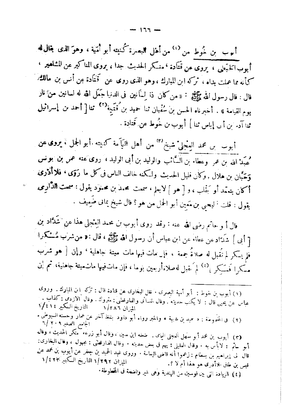 95 - أَيُّوب بْن مُحَمَّد الْعِجْلِي شيخ من أهل الْيَمَامَة كنيته أَبُو الْجمل يروي عَن عَبْد اللَّهِ بْن عُمَر وَعَطَاء بْن السَّائِب والوليد بْن أَبِي الْوَلِيد روى عَنْهُ عُمَر بْن يُونُس وحبان بْن هِلَال وَكَانَ قَلِيل الْحَدِيث وَلكنه خَالف النَّاس فِي كُل مَا روى فَلَا أَدْرِي أَكَانَ يتَعَمَّد أَوْ يقلب وَهُوَ لَا يعلم سَمِعْتُ مُحَمَّدَ بْنَ مَحْمُودٍ يَقُولُ سَمِعْتُ الدَّارِمِيَّ يَقُولُ قُلْتُ لِيَحْيَى بْن معِين أَبُو الْحمل من هُوَ قَالَ شيخ ضَعِيف قَالَ أَبُو حَاتِم رَضِي الله عَنْهُ وَقَدْ رَوَى أَيُّوبُ بْنُ مُحَمَّد الْعجلِيّ هَذَا عَن شَدَّاد بن أبي شَدَّاد عَن عَطاء عَن بْنِ عَبَّاسٍ أَنَّ رَسُولَ اللَّهِ صَلَّى اللَّهُ عَلَيْهِ وَسَلَّمَ قَالَ مَنْ شَرِبَ مُسْكِرًا فَلَمْ يَسْكَرْ لَمْ تُقْبَلْ لَهُ صَلاةٌ جُمُعَةً فَإِنْ مَاتَ فِيهَا مَاتَ مِيتَةً جَاهِلِيَّةً وَإِنْ هُوَ شَرِبَ مُسْكِرًا فَسَكِرَ لَمْ تُقْبَلْ لَهُ صَلاةٌ أَرْبَعِينَ يَوْمًا فَإِنْ مَاتَ فِيهَا مَاتَ مِيتَةً جَاهِلِيَّةً ثُمَّ إِنْ