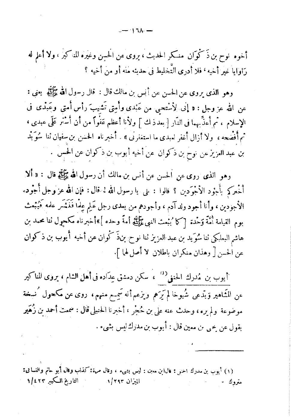 أَخُوهُ نوح بْن ذكْوَان مُنكر الْحَدِيث يروي عَن الْحَسَن وَغَيره الْمَنَاكِير وَلَا أعلم لَهُ رَاوِيا غَيْر أَخِيه فَلَا أَدْرِي التَّخْلِيط فِي حَدِيثه مِنْهُ أَوْ من أَخِيه وَهُوَ الَّذِي يَرْوِي عَنِ الْحَسَنِ عَنْ أَنَسِ بْنِ مَالِكٍ قَالَ قَالَ رَسُولُ اللَّهِ صَلَّى اللَّهُ عَلَيْهِ وَسَلَّمَ يَعْنِي عَن الله عز وَجل اني لاستحيي مِنْ عَبْدِي وَأَمَتِي تَشِيبُ رَأْسُ أَمَتِي وَعَبْدِي فِي الإِسْلامِ ثُمَّ أُعَذِّبُهُمَا فِي النَّارِ بَعْدَ ذَلِكَ وَلأَنَا أَعْظَمُ عَفْوًا مِنْ أَنْ أَسْتُرَ عَلَى عَبْدِي ثُمَّ أَفْضَحَهُ وَلا أَزَالُ أَغْفِرُ لِعَبْدِي مَا اسْتَغْفَرَنِي أَخْبَرَنَاهُ الْحَسَنُ بْنُ سُفْيَانَ ثَنَا سُوَيْدُ بْنُ عَبْدِ الْعَزِيزِ عَنْ نُوحِ بْنِ ذَكْوَانَ عَنْ أَخِيهِ أَيُّوبَ بْنِ ذَكْوَانَ عَنِ الْحَسَنِ وَهُوَ الَّذِي رَوَى عَنِ الْحَسَنِ عَنْ أَنَسِ بْنِ مَالِكٍ أَنَّ رَسُولَ اللَّهِ صَلَّى اللَّهُ عَلَيْهِ وَسلم قَالَ الا اخيركم بِأَجْوَدِ الأَجْوَدِينَ قَالُوا بَلَى يَا رَسُولَ اللَّهِ قَالَ فَإِنَّ اللَّهَ عَزَّ وَجَلَّ أَجْوَدُ الأَجْوَدِينَ وَأَنَا أَجْوَدُ وَلَدِ آدَمَ وَأَجْوَدُهُمْ مِنْ بَعْدِي رَجَلٌ عَلِمَ عِلْمًا فَنَشَرَ عِلْمَهُ فَيُبْعَثُ يَوْمَ الْقِيَامَةِ أُمَّةً وَحْدَهُ كَمَا يُبْعَثُ النَّبِيُّ صَلَّى اللَّهُ عَلَيْهِ وَسَلَّمَ أُمَّةً وَحْدَهُ أَخْبَرَنَاهُ مَكْحُولٌ ثَنَا مُحَمَّدُ بْنُ هَاشِمٍ الْبَعْلَبَكِّيُّ ثَنَا سُوَيْدُ بْنُ عَبْدِ الْعَزِيزِ ثَنَا نُوحُ بْنُ ذَكْوَانَ عَنْ أَخِيهِ أَيُّوبَ بْنِ ذَكْوَانَ عَنِ الْحَسَنِ وَهَذَانِ مُنْكَرَانِ باطلان لَا أصل لَهما