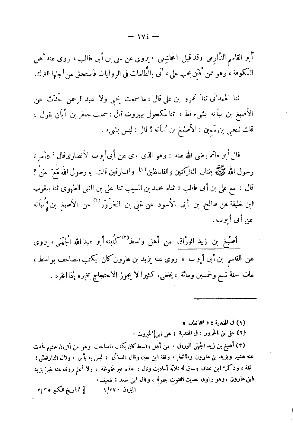أَبُو الْقَاسِم الدَّارمِيّ وَقَدْ قيل الْمُجَاشِعِي يروي عَن عَلِي بْن أَبِي طَالِب روى عَنْهُ أهل الْكُوفَة وَهُوَ مِمَّن فتن بحب عَلَي أَتَى بالطامات فِي الرِّوَايَات فَاسْتحقَّ من أجلهَا التّرْك ثَنَا الْهَمْدَانِيُّ ثَنَا عَمْرُو بْنُ عَلِيٍّ قَالَ مَا سَمِعْتُ يَحْيَى وَلا عَبْدَ الرَّحْمَنِ حَدَّثَ عَنِ الأَصْبَغِ بْنِ نُبَاتَةَ بِشَيْءٍ قَطُّ ثَنَا مَكْحُولٌ بِبَيْرُوتَ قَالَ سَمِعْتُ جَعْفَرَ بْنَ أَبَانٍ يَقُولُ قُلْتُ لِيَحْيَى بْنِ مَعِينٍ الأَصْبَغُ بْنُ نُبَاتَةَ قَالَ لَيْسَ بِشْيَءٍ قَالَ أَبُو حَاتِم رَضِي الله عَنْهُ وَهُوَ الَّذِي رَوَى عَنْ أَبِي أَيُّوبَ الأَنْصَارِيِّ قَالَ أَمَرَنَا رَسُولُ اللَّهِ صَلَّى اللَّهُ عَلَيْهِ وَسلم بِقِتَال النَّاكِثِينَ والقاسظين وَالْمَارِقِينَ قُلْتُ يَا رَسُولَ اللَّهِ مَعَ مَنْ قَالَ مَعَ عَلِيِّ بْنِ أَبِي طَالِبٍ ثناه مُحَمَّدُ بْنُ الْمُسَيِّبِ ثَنَا عَلِيُّ بْنُ الْمُثَنَّى الطَّهَوِيُّ ثَنَا يَعْقُوبُ بْنُ خَلِيفَةَ عَنْ صَالِحِ بْنِ أَبِي الأَسْوَدِ عَنْ عَلِيِّ بْنِ الْحَزَوَّرِ عَنِ الأَصْبَغِ بْنِ نُبَاتَةَ عَنْ أبي أَيُّوب
