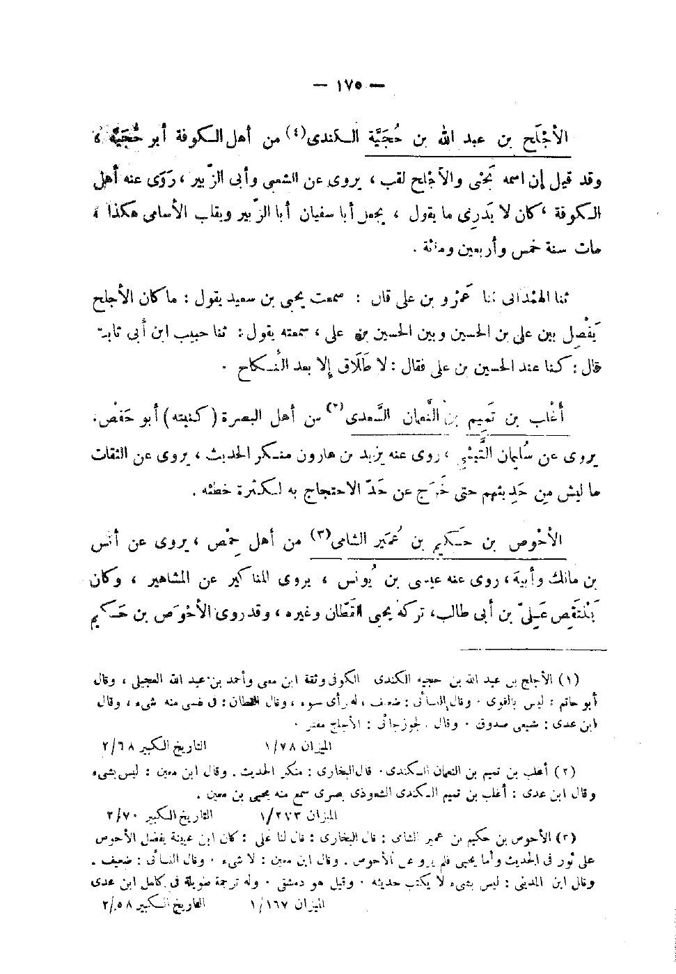 108 - الْأَجْلَح بْن عَبْد اللَّهِ بْن حجية الْكِنْدِيّ من أهل الْكُوفَة أَبُو حجية وَقَدْ قيل إِن اسْمه يَحْيَى وَالْأَجْلَح لقب يروي عَن الشَّعْبِي وَأبي الزُّبَيْر روى عَنهُ أهل الْكُوفَة كَانَ لايدرك مَا يَقُول يَجْعَل أَبَا سُفْيَان أَبَا الزُّبَيْر ويقلب الْأَسَامِي هَكَذَا مَات سنة خمس أَرْبَعِينَ وَمِائَة ثَنَا الْهَمْدَانِيُّ ثَنَا عَمْرُو بْنُ عَليّ قَالَ سَمِعت يحيى بن سَعِيدٍ يَقُولُ مَا كَانَ الأَجْلَحُ يَفْصِلُ بَيْنَ عَلِيِّ بْنِ الْحُسَيْنِ وَبَيْنَ الْحُسَيْنِ بْنِ عَلِيٍّ سَمِعْتُهُ يَقُولُ ثَنَا حَبِيبُ بْنُ أَبِي ثَابِتٍ قَالَ كُنَّا عِنْدَ الْحُسَيْنِ بن على فَقَالَ لإِطْلَاق الْأَبْعَد النِّكَاحِ