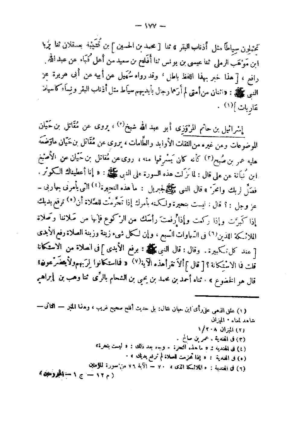 112 - إِسْرَائِيل بْن حَاتِم الْمروزِي أَبُو عَبْد اللَّهِ شيخ يروي عَن مقَاتل بْن حَيَّان الموضوعات وَعَن غَيره من الثِّقَات الأوابد والطامات يروي عَن مقَاتل بْن حَيَّان مَا وَضعه عَلَيْهِ عُمَر بْن صبح كَأَنَّهُ كَانَ يسرقها مِنْهُ رَوَى عَنْ مُقَاتِلِ بْنِ حَيَّانَ عَنِ الأَصْبَغِ بْنِ نَبَاتَةَ عَنْ عَلِيٍّ قَالَ لَمَّا نَزَلَتْ هَذِهِ السُّورَةُ عَلَى النَّبِيِّ صَلَّى اللَّهُ عَلَيْهِ وَسَلَّمَ إِنَّا أَعْطَيْنَاكَ الْكَوْثَر فصلى لِرَبِّك وانحر قَالَ النَّبِيُّ صَلَّى اللَّهُ عَلَيْهِ وَسَلَّمَ لِجِبْرِيلَ مَا هَذِهِ النُّحَيْرَةُ الَّتِي يَأْمُرُنِي بِهَا رَبِّي عَزَّ وَجَلَّ قَالَ لَيْسَتْ بِنُحَيْرَةٍ وَلَكِنَّهُ بِأَمْرك إِذَا تَحَرَّمْتَ لِلصَّلاةِ أَنْ تَرْفَعَ يَدَيْكِ إِذَا كَبَّرْتَ وَإِذَا رَكَعْتَ وَإِذَا رَفَعْتَ رَأْسَكَ مِنَ الرُّكُوعِ فَإِنَّهَا مِنْ صَلاتِنَا وَصَلاةِ الْمَلائِكَةِ الَّذِينَ فِي السَّمَاوَاتِ السَّبْعِ وَإِنَّ لِكُلِّ شَيْءٍ زِينَةً وَزِينَةُ الصَّلاةِ رَفْعُ الأَيْدِي عِنْدَ كُلِّ تَكْبِيرَةٍ وَقَالَ قَالَ النَّبِيُّ صَلَّى اللَّهُ عَلَيْهِ وَسلم بِرَفْع الأَيْدِي فِي الصَّلاةِ مِنَ الاسْتِكَانَةِ قُلْتُ فَمَا الاسْتِكَانَةُ قَالَ أَلا تَقْرَأُ هَذِهِ الآيَةَ فَمَا اسْتَكَانُوا لرَبهم ولأيتضرعون قَالَ هُوَ الْخُضُوعُ ثناه أَحْمَدُ بْنُ مُحَمَّدِ بْنِ يَحْيَى بْنِ الشَّحَّامِ بِالرَّيِّ ثَنَا وَهْبُ بْنُ إِبْرَاهِيم