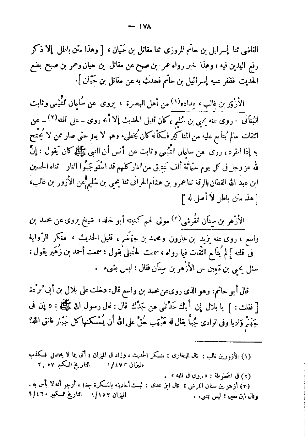 113 - الْأَزْوَر بْن غَالب عداده من أهل الْبَصْرَة يروي عَن سُلَيْمَان التَّيْمِي وثابت الْبنانِيّ روى عَنْهُ يَحْيَى بن سلم كَانَ قَلِيل الْحَدِيث إِلَّا أَنه روى عَلَى قلته عَن الثِّقَات مَا لَمْ يُتَابع عَلَيْهِ من الْمَنَاكِير فَكَأَنَّهُ كَانَ يُخطئ وَهُوَ لَا يعلم حَتَّى صَار مِمَّن لَا يحْتَج بِهِ إِذَا انْفَرد رَوَى عَنْ سُلَيْمَانَ التَّيْمِيِّ وَثَابِتٍ عَنْ أَنَسٍ أَنَّ النَّبِيَّ صَلَّى اللَّهُ عَلَيْهِ وَسَلَّمَ كَانَ يَقُولُ إِنَّ لِلَّهِ عَزَّ وَجَلَّ فِي كل يَوْم سِتّمائَة ألف عتق مِنَ النَّارِ كُلَّهُمْ قَدِ اسْتَوْجَبُوا النَّارَ ثناه الْحُسَيْنُ بْنُ عَبْدِ اللَّهِ الْقَطَّانُ بِالرَّقَّةِ ثَنَا عَمْرُو بْنُ هِشَامٍ الْحَرَّانِيُّ ثَنَا يَحْيَى بْنُ سُلَيْمٍ عَنِ الأَزْوَرِ بْنِ غَالِبٍ هَذَا مَتْنٌ بَاطِلٌ لَا أصل لَهُ الْأَزْهَر بْن سِنَان الْقرشِي مولى لَهُمْ كنيته أَو خَالِد شيخ يَرْوِي عَن مُحَمَّد بن وَاسع روى عَنْهُ يَزِيد بْن هَارُون وَمُحَمّد بْن جَهْضَم قَلِيل الْحَدِيث مُنكر الرِّوَايَة فِي قلته لَمْ يُتَابع الثِّقَات فِيمَا رَوَاهُ سَمِعت الْحَنْبَلِيَّ يَقُولُ سَمِعْتُ أَحْمَدَ بْنَ زُهَيْر يَقُول سُئِلَ يَحْيَى بْن معِين عَن الْأَزْهَر بْن سِنَان فَقَالَ لَيْسَ بِشَيْءٍ قَالَ أَبُو حَاتِم وَهُوَ الَّذِي رَوَى عَنْ مُحَمَّدِ بْنِ وَاسِعٍ قَالَ دَخَلْتُ عَلَى بِلالِ بْنِ أَبِي بُرْدَةَ فَقُلْتُ يَا بِلالُ إِنَّ أَبَاكَ حَدَّثَنِي عَنْ جَدِّكَ قَالَ قَالَ رَسُولُ اللَّهِ صَلَّى اللَّهُ عَلَيْهِ وَسَلَّمَ إِنَّ فِي جَهَنَّمَ وَادِيًا وَفِي الْوَادِي جُبًّا يُقَالُ لَهُ هَبْهَبُ حَقٌّ عَلَى اللَّهِ أَنْ يَسْكُنَهَا كُلُّ جَبَّارٍ فَاتَّقِ اللَّهِ