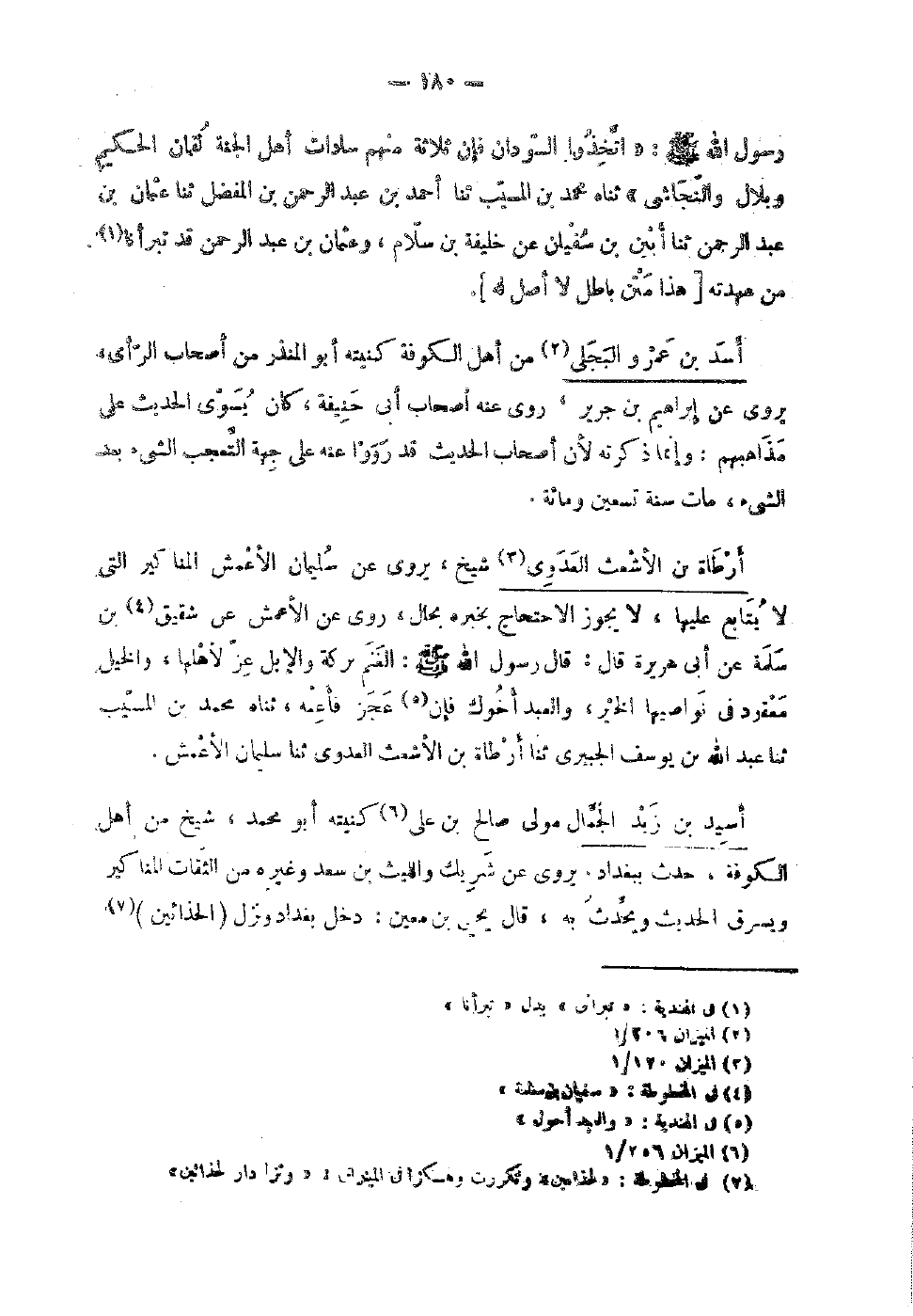 117 - أَسد بْن عَمْرو البَجلِيّ من أهل الْكُوفَة كنيته أَبُو الْمُنْذر من أَصْحَاب الرَّأْي يَرْوِي عَن إِبْرَاهِيم بْن جَرِير روى عَنْهُ أَصْحَاب أَبِي حَنِيفَة كَانَ يُسَوِّي الْحَدِيث عَلَى مذاهبهم وَإِنَّمَا ذكرته لِأَن أَصْحَاب الْحَدِيث قَدْ رووا عَنْهُ عَلِى جِهَة التَّعَجُّب الشَّيْء بَعْد الشَّيْء مَات سنة تسعين وَمِائَة