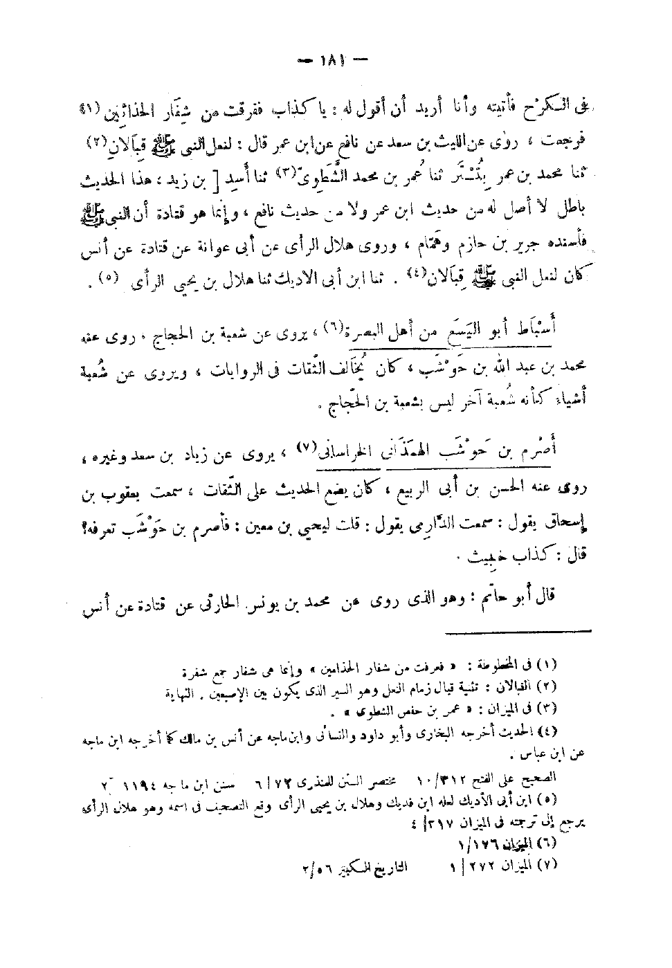 فِي الكرخ فَأَتَيْته وَأَنا أُرِيد أَن أَقُول لَهُ يَا كَذَّاب ففرقت من شفار الحذائين فَرَجَعت رَوَى عَنِ اللَّيْثِ بْنِ سَعْدٍ عَنْ نَافِعٍ عَن بن عُمَرَ قَالَ لِنَعْلِ النَّبِيِّ صَلَّى اللَّهُ عَلَيْهِ وَسَلَّمَ قِبَالانِ ثَنَا مُحَمَّدُ بْنُ عُمَرَ بِتُسْتَرَ ثَنَا عُمَرُ بْنُ مُحَمَّدٍ الشَّطَوِيُّ ثَنَا أَسد بْنُ زَيْدٍ هَذَا الْحَدِيثُ بَاطِلٌ لَا أَصْلَ لَهُ مِنْ حَدِيثِ بْنِ عُمَرَ وَلا مِنْ حَدِيثِ نَافِعٍ وَإِنَّمَا هُوَ قَتَادَةُ أَنَّ النَّبِي صَلَّى اللَّهُ عَلَيْهِ وَسَلَّمَ فَأَسْنَدَهُ جَرِيرُ بْنُ حَازِمٍ وَهَمَّامٌ وَرَوَى هِلالِ الرَّأْيِ عَنْ أَبِي عَوَانَةَ عَنْ قَتَادَةَ عَنْ أَنَسِ كَانَ لفعل النَّبِي صَلَّى اللَّهُ عَلَيْهِ وَسَلَّمَ قبالان ثَنَا بن أَبِي الأَدْيَكِ ثَنَا هِلالُ بْنُ يحيى الرَّأْي