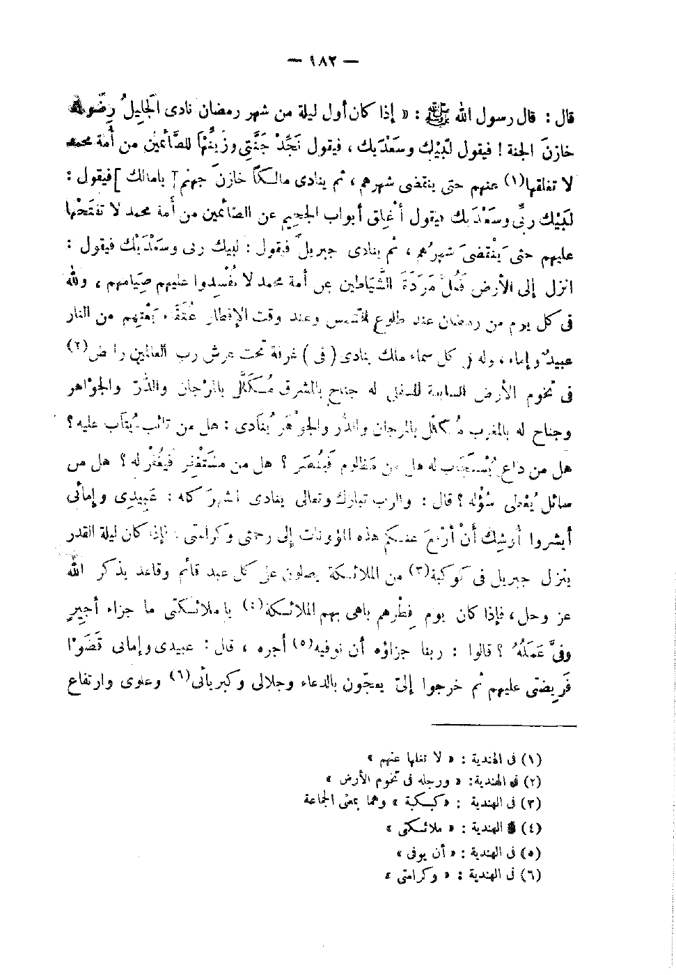 قَالَ قَالَ رَسُولُ اللَّهِ صَلَّى اللَّهُ عَلَيْهِ وَسَلَّمَ إِذا كَانَ أَوَّلُ لَيْلَةٍ مِنْ شَهْرِ رَمَضَانَ نَادَى الْجَلِيلُ رِضَوانَ خَازِنَ الْجَنَّةِ فَيَقُولُ لَبَّيْكَ وَسَعْدَيْكَ فَيَقُولُ نَجِّدْ جَنَّتِي وَزَيِّنْهَا لِلصَّائِمِينَ مِنْ أُمَّةِ مُحَمَّدٍ لَا تُغْلِقْهَا عَنْهُمْ حَتَّى يَنْقَضِي شهرهم ثَنَا يُنَادِي مَالِكًا خَازِنَ جَهَنَّمَ يَا مَالِكُ فَيَقُولُ لَبَّيْكَ رَبِّي وَسَعْدَيْكَ فَيَقُولُ أَغْلِقْ أَبْوَابَ الْجَحِيمِ عَنِ الصَّائِمِينَ مِنْ أُمَّةِ مُحَمَّدٍ لَا تَفْتَحْهَا عَلَيْهِمْ حَتَّى يَنْقَضِيَ شَهْرُهُمْ ثُمَّ يُنَادِي جِبْرِيلَ فَيَقُولُ لَبَّيْكَ رَبِّي سعديك فَيَقُولُ انْزِلْ إِلَى الأَرْضِ فَغُلَّ مَرَدَةَ الشَّيَاطِينِ عَنْ أُمَّةِ مُحَمَّدٍ لَا يفسدوا عَلَيْهِم صِيَام وَلِلَّهِ فِي كُلِّ يَوْمٍ مِنْ رَمَضَانَ عِنْدَ طُلُوعِ الشَّمْسِ وَعِنْدَ وَقْتِ الإِفْطَارِ عُتَقَاءُ يَعْتِقُهُمْ مِنَ النَّار عبيد وَإِمَّا وَله فِي كل سَمَاء مَالك يُنَادِي فِي غُرْفَةٍ تَحْتَ عَرْشِ رب العاملين رَابِضٌ فِي تُخُومِ الأَرْضِ السَّابِعَةِ السُّفْلَى لَهُ جَنَاحٌ بِالْمَشْرِقِ مُكَلَّلٌ بِالْمَرْجَانِ وَالدُّرِّ وَالْجَوَاهِرِ وَجَنَاحٌ لَهُ بِالْمَغْرِبِ مُكَلَّلٌ بِالْمَرْجَانِ وَالدُّرِّ وَالْجَوْهَرِ يُنَادِي هَلْ مِنْ تَائِبٍ يُتَابُ عَلَيْهِ هَلْ مِنْ دَاعٍ يُسْتَجَابُ لَهُ هَلْ مِنْ مَظْلُومٍ فَيُنْصَرُ هَلْ مِنْ مُسْتَغْفِرٍ فَيُغْفَرُ لَهُ هَلْ مِنْ سَائِلٍ يُعْطَى سُؤْلَهُ قَالَ وَالرَّبُّ تَبَارَكَ وَتَعَالَى يُنَادِي الشَّهْرَ كُلَّهُ عَبِيدِي وَإِمَائِي أَبْشِرُوا أوشك أَن أَربع عَنْكُم هَذِه المؤونات إِلَى رَحْمَتِي وَكَرَامَتِي فَإِذَا كَانَ لَيْلَة الْقدر ينزل جِبْرَائِيل فِي كَوْكَبَةٍ مِنَ الْمَلائِكَةِ يُصَلُّونَ عَلَى كُلِّ عَبْدٍ قَائِمٍ وَقَاعِدٍ يَذْكُرُ اللَّهَ عَزَّ وَجَلَّ فَإِذَا كَانَ يَوْمُ فِطْرِهِمْ بَاهَى بِهِمُ الْمَلائِكَةَ يَا مَلائِكَتِي مَا جَزَاءُ أَجِيرٍ وَفَّى عَمَلَهُ قَالُوا رَبَّنَا جزاءه أَنْ نُوَفِّيَهُ أَجْرَهُ قَالَ عَبِيدِي وَإِمَائِي قَضَوْا فَرِيضَتِي عَلَيْهِمْ ثُمَّ خَرجُوا إِلَى يعجون بِالدُّعَاءِ وكبريائي وعلوي وارتفاع
