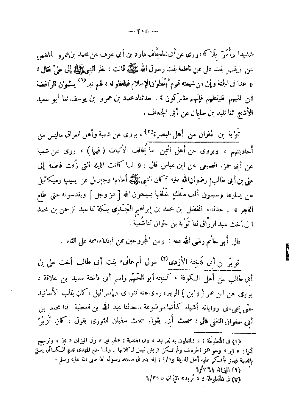 شَدِيدا وَأمر بِتَرْكِهِ رَوَى عَنْ أبي الحجاف دَاوُدَ بْنِ أَبِي عَوْفٍ عَنْ مُحَمَّد بن عَمْرو الْهَاشِمِي عَن زَيْنَب عَلِيٍّ عَنْ فَاطِمَةَ بِنْتِ رَسُولِ اللَّهِ صَلَّى اللَّهُ عَلَيْهِ وَسَلَّمَ قَالَتْ نَظَرَ النَّبِيُّ صَلَّى اللَّهُ عَلَيْهِ وَسَلَّمَ إِلَى عَلِيٍّ فَقَالَ هَذَا فِي الْجَنَّةِ وَإِنَّ مِنْ شِيعَتِهِ قَوْمٌ يُعطونَ الإِسْلامَ فَيَلْفِظُونَهُ لَهُ نَبْرٌ يُسَمُّونَ الرَّافِضَةُ فَمَنْ لَقِيَهُمْ فليقلهم فَإِنَّهُم مشروكون حدّثنَاهُ مُحَمَّد بن عَمْرو بْنِ يُوسُفَ ثَنَا أَبُو سَعِيدٍ الأَشَجُّ ثَنَا تَلِيدُ بْنُ سُلَيْمَانَ عَن أبي الجحاف