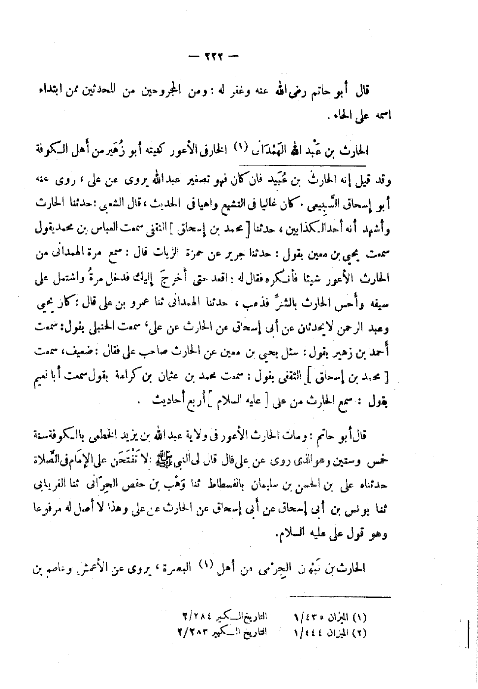 197 - الْحَارِث بْن عَبْد اللَّهِ الْهَمدَانِي الخارفي الْأَعْوَر كنيته أَبُو زُهَيْر من أهل الْكُوفَة وَقَدْ قيل إِنَّه الْحَارِث بْن عبيد فَإِن كَانَ فَهُوَ تَصْغِير عَبْد اللَّهِ يَرْوِي عَن عَلِي روى عَنْهُ أَبُو إِسْحَاق السبيعِي كَانَ غاليا فِي التَّشَيُّع واهيا فِي الْحَدِيث قَالَ الشَّعْبِي حَدثنَا الْحَارِث وَأشْهد أَنَّهُ أحدالكذابين حَدثنَا مُحَمَّد بن إِسْحَاق الثَّقَفِيّ سَمِعْتُ الْعَبَّاسَ بْنَ مُحَمَّدٍ يَقُولُ سَمِعت يحيى بن معِين يَقُول حَدَّثَنَا جَرِيرٌ عَنْ حَمْزَةَ الزَّيَّاتِ قَالَ سَمِعَ مُرَّةُ الْهَمْدَانِيُّ مِنَ الْحَارِثِ الأَعْوَرِ شَيْئًا فَأَنْكَرَهُ فَقَالَ لَهُ اقْعُدْ حَتَّى أَخْرُجَ إِلَيْكَ فَدَخَلَ مُرَّةُ وَاشْتَمَلَ عَلَى سَيْفِهِ وَأَحَسَّ الْحَارِثُ بِالشَّرِّ فَذَهَبَ حَدَّثَنَا الْهَمْدَانِيُّ ثَنَا عَمْرُو بْنُ عَلِيٍّ قَالَ كَانَ يَحْيَى وَعَبْدُ الرَّحْمَنِ لَا يحدثنان عَنْ أَبِي إِسْحَاقَ عَنِ الْحَارِثِ عَنْ عَلِيٍّ سَمِعْتُ الْحَنْبَلِيَّ يَقُولُ سَمِعت أَحْمَد بْن زُهَيْر يَقُول سُئِلَ يَحْيَى بْن معِين عَن الْحَارِثِ صَاحِبِ عَلِيٍّ فَقَالَ ضَعِيفٌ سَمِعت مُحَمَّد بن إِسْحَاق الثَّقَفِيّ يَقُولُ سَمِعْتُ مُحَمَّدَ بْنَ عُثْمَانَ بْنِ كَرَامَةَ يَقُولُ سَمِعْتُ أَبَا نُعَيْمٍ يَقُولُ سَمِعَ الْحَارِثُ مِنْ عَليّ عَلَيْهِ السَّلَام أَربع أحايث قَالَ أَبُو حَاتِم وَمَاتَ الْحَارِث الْأَعْوَر فِي ولَايَة عَبْد اللَّهِ بْن يَزِيد الخطمي بِالْكُوفَةِ سنة خمس وَسِتِّينَ وَهُوَ الَّذِي رَوَى عَنْ عَلِيٍّ قَالَ قَالَ لِي النَّبِي صَلَّى اللَّهُ عَلَيْهِ وَسَلَّمَ لَا تَفْتَحَنَّ عَلَى الإِمَامِ فِي الصَّلَاة حدّثنَاهُ عَلِيُ بْنُ الْحَسَنِ بْنِ سُلَيْمَانَ بِالْفُسْطَاطِ ثَنَا وَهْبُ بْنُ حَفْصٍ الْحَرَّانِيُّ ثَنَا الْفِرْيَابِيُّ ثَنَا يُونُسُ بْنُ أَبِي إِسْحَاقَ عَنْ أَبِي إِسْحَاقَ عَنِ الْحَارِثِ عَنْ عَلِيٍّ وَهَذَا لَا أَصْلَ لَهُ مَرْفُوعًا وَهُوَ قَول عَليّ عَلَيْهِ السَّلَام