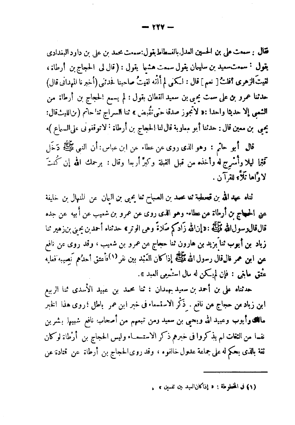 فَقَالَ سَمِعت عَلِي بْن الْحُسَيْن الْعدْل بالفسطاط يَقُول سَمِعت مُحَمَّد بْن عَلِي بْن دَاوُد الْبَغْدَادِيّ يَقُول سَمِعت سَعِيد بْن سُلَيْمَان يَقُول سَمِعت هشيما يَقُول قَالَ لي الْحَجَّاج بْن أَرْطَاة لقِيت الزُّهْرِيّ قُلْت نعم قَالَ لكني لَمْ ألقه لقِيت صحابنا فَحَدثني أخبرنَا المهداني قَالَ حَدثنَا عَمْرو بن عَليّ سَمِعت يحيى بن سعيد الْقطَّان يَقُولُ لَمْ يَسْمَعِ الْحَجَّاجُ بْنُ أَرْطَاةَ مِنَ الشَّعْبِيِّ إِلَّا حَدِيثًا وَاحِدًا لَا تَجُوزُ صَدَقَةٌ حَتَّى تُقْبَضَ ثَنَا السَّرَّاجُ ثَنَا حَاتِمُ بْنُ اللَّيْثِ قَالَ يَحْيَى بْنُ مَعِينٍ قَالَ حَدَّثَنا أَبُو مُعَاوِيَةَ قَالَ لَنَا الْحَجَّاجُ بْنُ أَرْطَاةَ لَا تُوَقِّفُونِي عَلَى السَّمَاعِ قَالَ أَبُو حَاتِم وَهُوَ الَّذِي رَوَى عَن عَطاء عَن بن عَبَّاسٍ أَنَّ النَّبِيَّ صَلَّى اللَّهُ عَلَيْهِ وَسَلَّمَ دَخَلَ قَبْرًا لَيْلا وَأَسْرَجَ لَهُ وَأَخَذَهُ مِنْ قِبَلِ الْقِبْلَةِ وَكَبَّرَ أَرْبَعًا وَقَالَ يَرْحَمُكَ الله إِن كنت لأوها تَلاءً لِلْقُرْآنِ ثناه عَبْدُ اللَّهِ بْنُ قَحْطَبَةَ ثَنَا مُحَمَّدُ بْنُ الصَّبَّاحِ ثَنَا يَحْيَى بْنُ الْيَمَانِ عَنِ الْمِنْهَالِ بْنِ خَلِيفَةَ عَنِ الْحَجَّاجِ بْنِ أَرْطَاةَ عَنْ عَطَاءٍ وَهُوَ الَّذِي رَوَى عَنْ عَمْرِو بْنِ شُعَيْبٍ عَنْ أَبِيهِ عَنْ جَدِّهِ قَالَ قَالَ رَسُولُ اللَّهِ صَلَّى اللَّهُ عَلَيْهِ وَسَلَّمَ أَن اللَّهَ زَادَكُمْ صَلاةً وَهِيَ الْوِتْرُ حَدَّثَنَاهُ أَحْمَدُ بْنُ يَحْيَى بْنِ زُهَيْر ثَنَا زِيَاد بنأيوب ثَنَا يَزِيدُ بْنُ هَارُونَ ثَنَا حَجَّاجٌ عَنْ عَمْرِو بْنِ شُعَيْبٍ وَقَدْ رَوَى عَنْ نَافِعٍ عَنِ بن عُمَر قَالَ قَالَ رَسُول الله صَلَّى اللَّهُ عَلَيْهِ وَسَلَّمَ إِذا كَانَ الْعَبْدُ بَيْنَ نَفَرٍ فَأَعْتَقَ أَحَدُهُمْ نَصِيبَهُ فَعَلَيْهِ عِتْقُ مَا بَقِيَ فَإِنْ لَمْ يَكُنْ لَهُ مَالٌ اسْتَسْعَى الْعَبْدُ حَدَّثَنَاهُ عَلِيُّ بْنُ أَحْمَدَ بْنِ سَعِيدٍ بِهَمْدَانَ ثَنَا مُحَمَّدُ بْنُ عُبَيْدٍ الأَسَدِيُّ ثَنَا الرَّبِيعُ بْنُ زِيَادٍ عَنْ حَجَّاجٍ عَنْ نَافِعٍ ذِكْرُ الاسْتِسْعَاءِ فِي خبر بن عُمَرَ بَاطِلٌ رَوَى هَذَا الْخَبَرَ مَالِكٌ وَأَيُّوبُ وَعُبَيْدُ اللَّهِ وَيَحْيَى بْنُ سَعِيدٍ وَمَنْ تَبِعَهُمْ مِنْ أَصْحَابِ نَافِعٍ شَبِيهًا بِشْرُ بْنُ نفسا مِنَ الثِّقَاتِ لَمْ يَذْكُرُوا فِي خَبَرِهِمْ ذِكْرَ الاسْتِسْعَاءِ وَلَيْسَ الْحَجَّاجُ بْنُ أَرْطَاةَ لَوْ كَانَ ثِقَةً بِالَّذِي يُحْكَمُ لَهُ عَلَى جَمَاعَةِ عُدُولٍ خَالَفُوهُ وَقَدْ رَوَى الْحَجَّاجُ بْنُ أَرطَاةَ عَنْ قَتَادَةَ عَن
