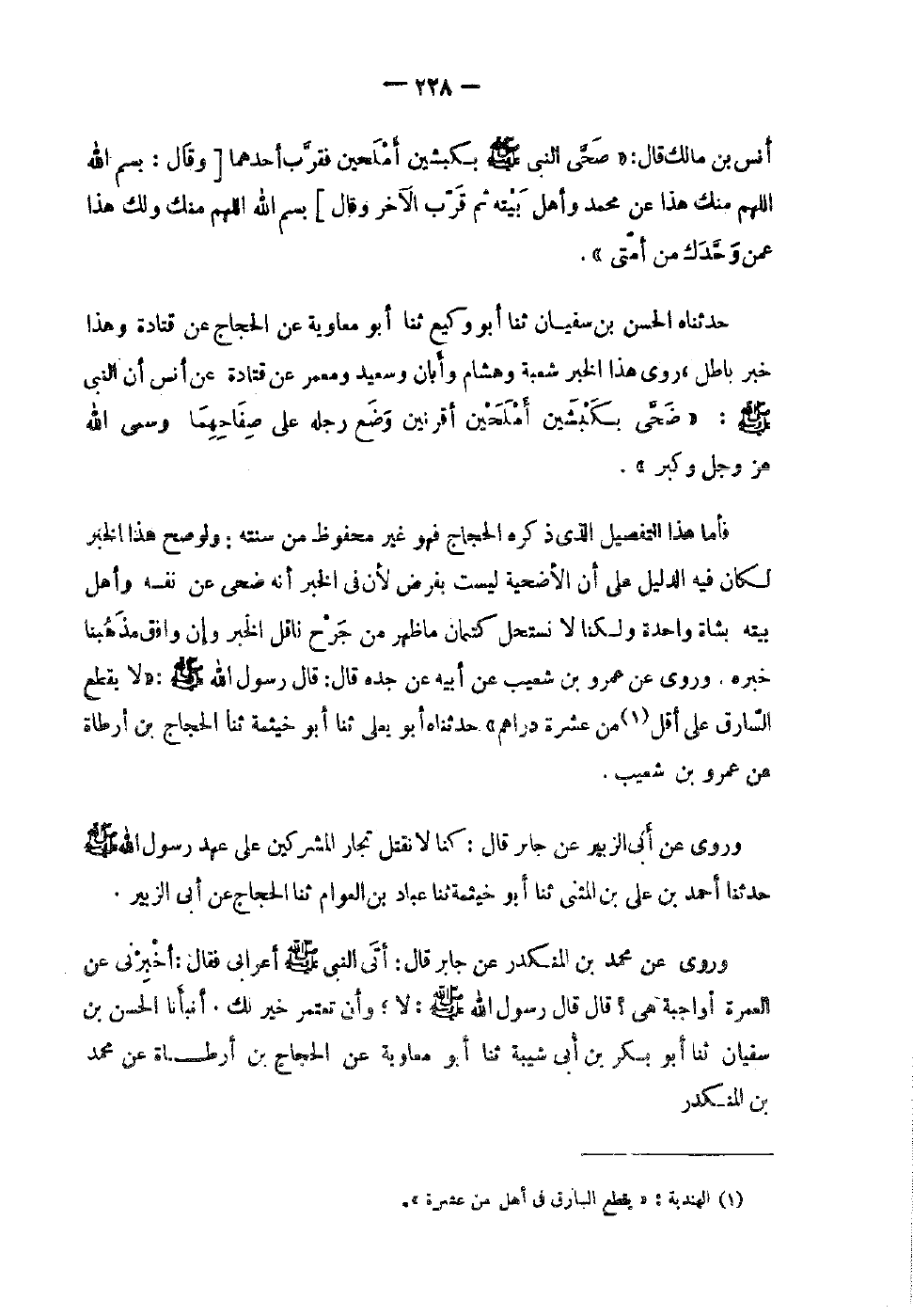 أَنَسِ بْنِ مَالِكٍ قَالَ ضَحَّى النَّبِي صَلَّى اللَّهُ عَلَيْهِ وَسَلَّمَ بِكَبْشَيْنِ أَمْلَحَيْنِ فَقَرَّبَ أَحَدُهُمَا وَقَالَ بِسْمِ اللَّهِ اللَّهُمَّ مِنْكَ هَذَا عَن مُحَمَّدٍ وَأَهْلِ بَيْتِهِ ثُمَّ قَرَّبَ الآخَرَ وَقَالَ بِسْمِ اللَّهِ اللَّهُمَّ مِنْكَ وَلَكَ هَذَا عَمَّنْ وحدكم مِنْ أُمَّتِي حَدَّثَنَاهُ الْحَسَنُ بْنُ سُفْيَانَ ثَنَا أَبُو وَكِيعٍ ثَنَا أَبُو مُعَاوِيَةَ عَنِ الْحَجَّاجِ عَنْ قَتَادَةَ وَهَذَا خَبَرٌ بَاطِلٌ رَوَى هَذَا الْخَبَرُ شُعْبَةُ وَهِشَامٌ وَأَبَانٌ وَسَعِيدٌ وَمَعْمَرٌ عَنْ قَتَادَةَ عَنْ أَنَسٍ أَنَّ النَّبِيَّ صَلَّى اللَّهُ عَلَيْهِ وَسلم ضحى بكبشين أملحن أَقْرَنَيْنِ وَضَعَ رِجْلَهُ عَلَى صِفَاحِهِمَا وَسَمَّى اللَّهَ عَزَّ وَجَلَّ وَكَبَّرَ فَأَما هَذَا التَّفْصِيل الَّذِي ذكره الْحَجَّاج فَهُوَ غَيْر مَحْفُوظ من سنته وَلَو صَحَّ هَذَا الْخَبَر لَكَانَ فِيهِ الدَّلِيل عَلَى أَن الْأُضْحِية لَيست بِفَرْض لِأَن فِي الْخَبَر أَنَّهُ ضحى عَن نَفْسه وَأهل بَيته بِشَاة وَاحِدَة وَلَكنَّا لَا نستحل كتمان مَا ظهر من جرح ناقل الْخَبَر وَإِن وَافق مَذْهَبنَا خَبره وَرَوَى عَنْ عَمْرِو بْنِ شُعَيْبٍ عَنْ أَبِيهِ عَنْ جَدِّهِ قَالَ قَالَ رَسُولُ اللَّهِ صَلَّى اللَّهُ عَلَيْهِ وَسَلَّمَ لَا يُقْطَعُ السَّارِقُ عَلَى أَقَلِّ مِنْ عَشَرَةَ دَرَاهِمَ حَدَّثَنَاهُ أَبُو يَعْلَى ثَنَا أَبُو خَيْثَمَةَ ثَنَا الْحَجَّاجُ بْنُ أَرْطَاةَ عَنْ عَمْرِو بْنِ شُعَيْبٍ وَرَوَى عَنْ أَبِي الزُّبَيْرِ عَنْ جَابِرٍ قَالَ كُنَّا لَا نَقْتُلُ تُجَّارَ الْمُشْرِكِينَ عَلَى عَهْدِ رَسُولِ اللَّهِ صَلَّى اللَّهُ عَلَيْهِ وَسَلَّمَ حَدَّثَنَا أَحْمَدُ بْنُ عَلِيِّ بْنِ الْمُثَنَّى ثَنَا أَبُو خَيْثَمَةَ ثَنَا عَبَّادُ بْنُ الْعَوَّامِ ثَنَا الْحَجَّاجُ عَنْ أَبِي الزُّبَيْرِ وَرَوَى عَنْ مُحَمَّدِ بْنِ الْمُنْكَدِرِ عَنْ جَابِرٍ قَالَ أَتَى النَّبِيَّ صَلَّى اللَّهُ عَلَيْهِ وَسَلَّمَ أَعْرَابِيٌّ فَقَالَ أَخْبَرَنِي عَن الْعُمْرَةِ أَوَاجِبَةٌ هِيَ قَالَ قَالَ رَسُولُ اللَّهِ صَلَّى اللَّهُ عَلَيْهِ وَسَلَّمَ لَا وَأَنْ تَعْتَمِرَ خَيْرٌ لَكَ أَنْبَأَنَا الْحَسَنُ بْنُ سُفْيَانَ ثَنَا أَبُو بَكْرِ بْنُ أَبِي شَيْبَةَ ثَنَا أَبُو مُعَاوِيَةَ عَنِ الْحَجَّاجِ بْنِ أَرْطَاة عَن مُحَمَّد بن الْمُنْكَدر