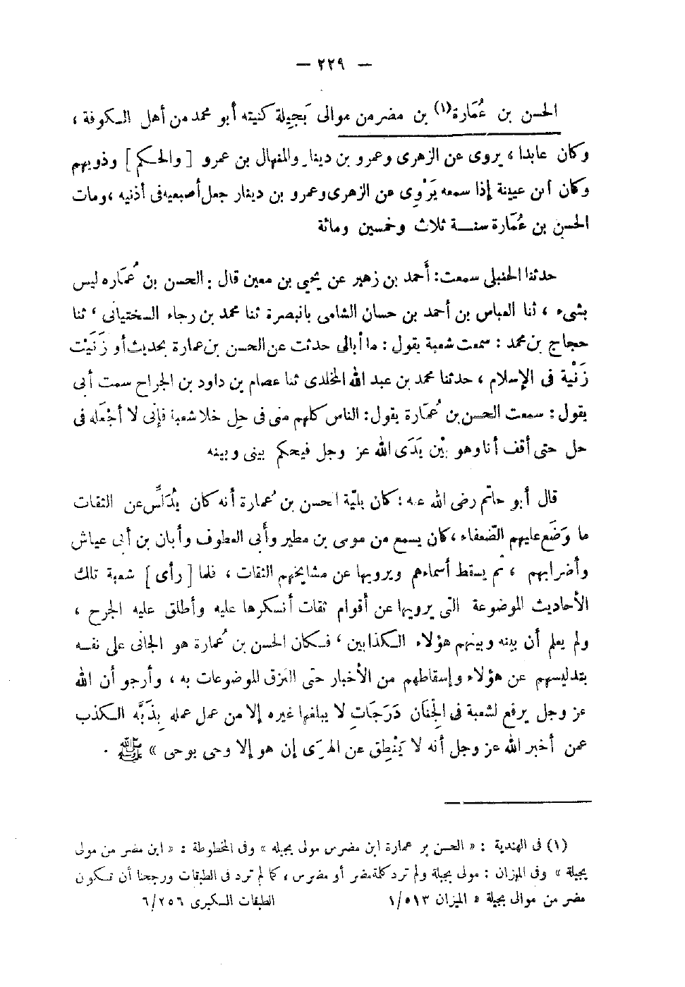 205 - الْحسن بْن عُمَارَة بْن مُضر من موَالِي بجيلة كنيته أَبُو مُحَمَّد من أهل الْكُوفَة وَكَانَ عابدا يروي عَن الزُّهْرِيّ وَعَمْرو بْن دِينَار والمنهال بْن عَمْرو وَالْحكم وذويهم وَكَانَ بن عُيَيْنَة إِذَا سَمعه يَرْوِي عَن الزُّهْرِيّ وَعَمْرو بْن دِينَار جعل أصبعيه فِي أُذُنَيْهِ وَمَاتَ الْحَسَن بْن عُمَارَة سنة ثَلاث وَخمسين وَمِائَة حَدَّثَنَا الْحَنْبَلِيُّ سَمِعْتُ أَحْمَدَ بن زُهَيْر عَن يحيى بن مَعِينٍ قَالَ الْحَسَنُ بْنُ عُمَارَةَ لَيْسَ بِشَيْءٍ ثَنَا الْعَبَّاسُ بْنُ أَحْمَدَ بْنِ حَسَّانٍ الشَّامِيُّ بِالْبَصْرَةِ ثَنَا مُحَمَّدُ بْنُ رَجَاءٍ السَّخْتِيَانِيُّ ثَنَا حَجَّاجُ بْنُ مُحَمَّدٍ سَمِعْتُ شُعْبَة يَقُول مَا أبلى حَدَّثْتُ عَنِ الْحَسَنِ بْنِ عُمَارَةَ بِحَدِيثٍ أَوْ زَنَيْتُ زَنْيَةً فِي الإِسْلامِ حَدَّثَنَا مُحَمَّدُ بْنُ عَبْدِ اللَّهِ الْمَخْلَدِيُّ ثَنَا عِصَامُ بْنُ دَاوُدَ بْنِ الْجَرَّاحِ سَمِعْتُ أَبِي يَقُولُ سَمِعْتُ الْحَسَنَ بْنَ عُمَارَةَ يَقُولُ النَّاسُ كُلُّهُمْ مِنِّي فِي حِلٍّ خَلا شُعْبَةَ فَإِنِّي لَا أَجْعَلُهُ فِي حِلٍّ حَتَّى أَقِفَ أَنَا وَهُوَ بَيْنَ يَدَيِ اللَّهِ عَزَّ وَجَلَّ فَيَحْكُمَ بَيْنِي وَبَيْنَهُ قَالَ أَبُو حَاتِم رَضِي الله عَنْهُ كَانَ بلية الْحَسَن بْن عُمَارة أَنه كَانَ يُدَلس عَن الثِّقَات مَا وضع عَلَيْهِم الضُّعَفَاء كَانَ يسمع من مُوسَى بْن مطير وَأبي العطوف وَأَبَان بْن أَبِي عَيَّاش وأضرابهم ثُمَّ يسْقط أَسْمَاءَهُم ويرويها عَن مشايخهم الثِّقَات فَلَمَّا رأى شُعْبَة تِلْكَ الْأَحَادِيث الْمَوْضُوعَة الَّتِي يَرْوِيهَا عَن أَقوام ثِقَات أنسكرها عَلَيْهِ وَأطلق عَلَيْهِ الْجرْح وَلَمْ يعلم أَن بَينه وَبينهمْ هَؤُلاءِ الْكَذَّابين فَكَانَ الْحَسَن بْن عُمَارَة هُوَ الْجَانِي عَلَى نَفْسه بتدليسهم عَن هَؤُلاءِ وإسقاطهم من الْأَخْبَار حَتَّى التزق الموضوعات بِهِ وَأَرْجُو أَن اللَّه عَزَّ وَجَلَّ يرفع لشعبة فِي الْجنان دَرَجَات لَا يبلغهَا غَيره إِلَى من عمل عمله بذبه الْكَذِب عَمَّن أخبر اللَّه عَزَّ وَجَلَّ أَنَّهُ لَا ينْطق عَن الْهوى إِن هُوَ إِلَّا وَحي يُوحى