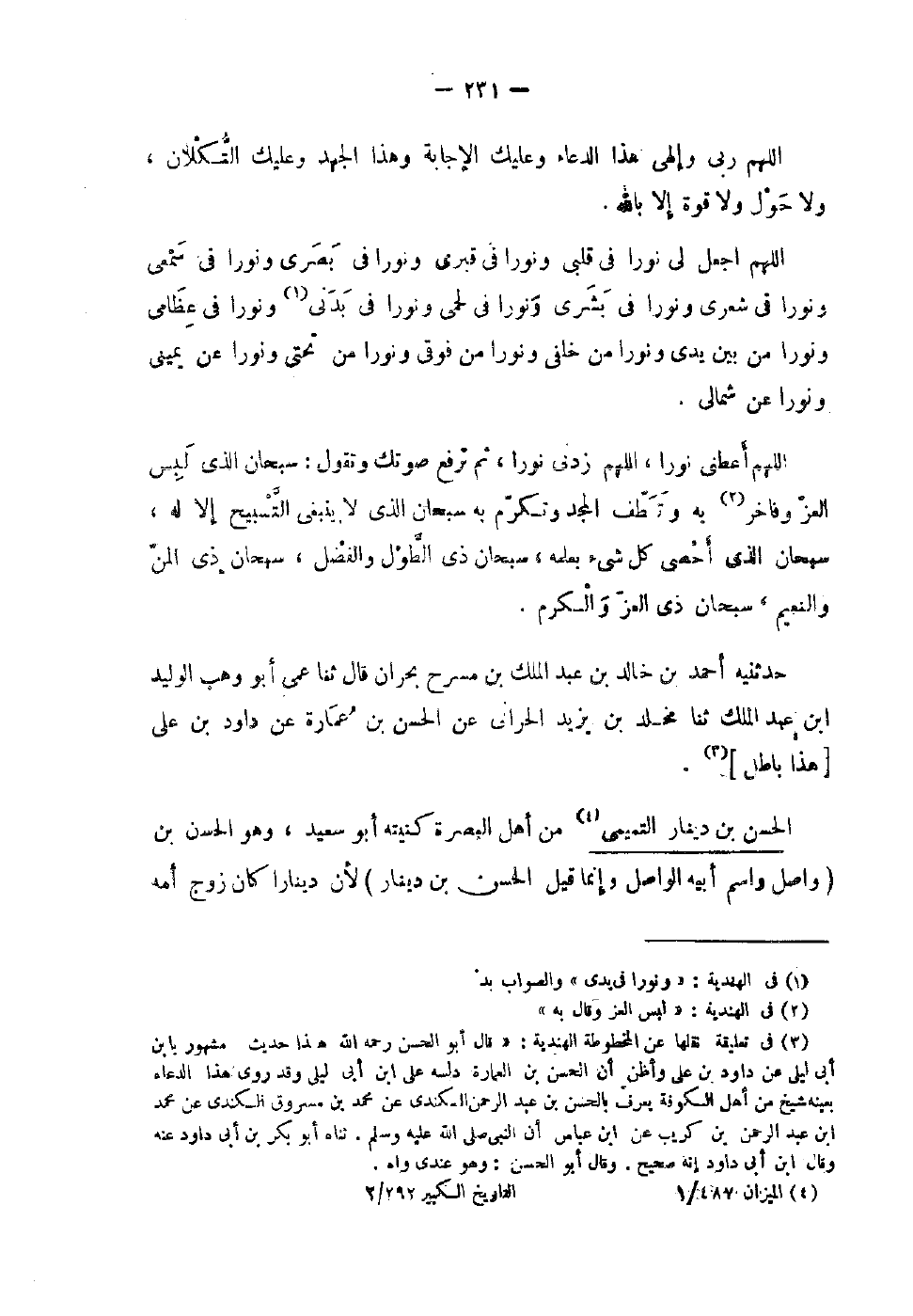 اللَّهُمَّ رَبِّي وَإِلَهِي هَذَا الدُّعَاءُ وَعَلَيْكَ الإِجَابَةُ وَهَذَا الْجَهْدُ وَعَلَيْكَ التُّكْلانُ وَلا حَوْلَ وَلا قُوَّةَ إِلا بِاللَّهِ اللَّهُمَّ اجْعَلْ لِي نُورًا فِي قَلْبِي وَنُورًا فِي قَبْرِي وَنُورًا فِي بَصَرِي وَنُورًا فِي سَمْعِي وَنُورًا فِي شَعْرِي وَنُورًا فِي بِشْرِي وَنُورًا فِي لحمي فِي بَدَنِي وَنُورًا فِي عِظَامِي وَنُورًا مِنْ بَيْنَ يَدَيَّ وَنُورًا مِنْ خَلْفِي وَنُورًا مِنْ فَوْقِي وَنُورًا مِنْ تَحْتِي وَنُورًا عَنْ يَمِينِي وَنُورًا عَنْ شِمَالِي اللَّهُمَّ أَعْطِنِي نُورًا اللَّهُمَّ زِدْنِي نُورًا ثُمَّ تَرْفَعُ صَوْتَكَ وَتَقُولُ سُبْحَانَ الَّذِي لَبِسَ الْعِزَّ وَفَاخَرَ بِهِ وَتَعَطَّفَ الْمَجْدَ وَتَكَرَّمَ بِهِ سُبْحَانَ الَّذِي لَا يَنْبَغِي التَّسْبِيحُ إِلا لَهُ سُبْحَانَ الَّذِي أَحْصَى كُلَّ شَيْءٍ بِعِلْمِهِ سُبْحَانَ ذِي الطَّوْلِ وَالْفَضْلِ سُبْحَانَ ذِي الْمَنِّ وَالنَّعِيمِ سُبْحَانَ ذِي الْعِزِّ وَالْكَرَمِ حَدَّثَنِيهِ أَحْمَدُ بْنُ خَالِدِ بْنِ عَبْدِ الْمَلِكِ بْنِ مُسَرِّحٍ بِحَرَّانَ قَالَ ثَنَا عَمِّي أَبُو وَهْبٍ الْوَلِيدُ بْنُ عَبْدِ الْمَلِكِ ثَنَا مَخْلَدُ بن زييد الْحَرَّانِيُّ عَنِ الْحَسَنِ بْنِ عُمَارَةَ عَنْ دَاوُدَ بْنِ عَلِيٍّ هَذَا بَاطِل