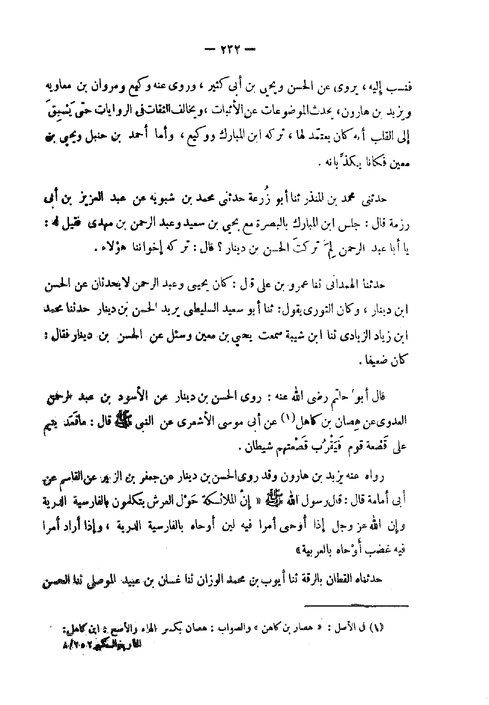 فنسب إِلَيْهِ يروي عَن السحن وَيَحْيَى بْن أَبِي كثير وَروى عَنْهُ وَكِيع ومروان بْن مُعَاوِيَة وَيزِيد بن هَارُون يحدث الموضعات عَن الْأَثْبَات وَيُخَالف الثِّقَات فِي الرِّوَايَات حَتَّى يسْبق إِلَى الْقلب أَنه كَانَ يعْتَمد لَهَا تَركه بن الْمُبَارك ووكيع وَأَمَّا أَحْمَد بْن حَنْبَل وَيَحْيَى بْن معِين فَكَانَا يكذبانه حَدَّثَنِي مُحَمَّدُ بْنُ الْمُنْذِرِ ثَنَا أَبُو زُرْعَةَ حَدَّثَنِي مُحَمَّدُ بن شبويه عَنْ عَبْدِ الْعَزِيزِ بْنِ أَبِي رزمة قَالَ جلس بن الْمُبَارَكِ بِالْبَصْرَةِ مَعَ يَحْيَى بْنِ سَعِيدٍ وَعَبْدِ الرَّحْمَنِ بْنِ مَهْدِيٍّ فَقِيلَ لَهُ يَا أَبَا عَبْدِ الرَّحْمَنِ لَمْ تَرَكْتَ الْحَسَنَ بْنَ دِينَارٍ قَالَ تَرَكَهُ إِخْوَانُنَا هَؤُلاءِ حَدَّثَنَا الْهَمْدَانِيُّ ثَنَا عَمْرُو بْنُ عَلِيٍّ قَالَ كَانَ يَحْيَى وَعَبْدُ الرَّحْمَنِ لَا يُحَدِّثَانِ عَنِ الْحَسَنِ بْنِ دِينَارٍ وَكَانَ الثَّوْرِيُّ يَقُولُ ثَنَا أَبُو سَعِيدٍ السَّلِيطِيُّ يُرِيدُ الْحَسَنَ بْنَ دِينَارٍ حَدَّثَنَا مُحَمَّدُ بن زِيَاد الزيَادي ثَنَا بن شَيْبَةَ سَمِعْتُ يَحْيَى بْنَ مَعِينٍ وَسُئِلَ عَنِ الْحَسَنِ بْنِ دِينَارٍ فَقَالَ كَانَ ضَعِيفًا قَالَ أَبُو حَاتِم رَضِي الله عَنْهُ رَوَى الْحَسَنُ بْنُ دِينَارٍ عَنِ الأَسْوَدِ بْنِ عَبْدِ الرَّحْمَنِ الْعَدَوِيِّ عَنْ هَصَّانَ بْنِ كَاهِلٍ عَنْ أَبِي مُوسَى الأَشْعَرِيِّ عَنِ النَّبِي صَلَّى اللَّهُ عَلَيْهِ وَسَلَّمَ قَالَ مَا قَعَدَ يَتِيمٌ عَلَى قَصْعَةِ قَوْمٍ فَيَقْرَبُ قَصْعَتَهُمْ شَيْطَانٌ رَوَاهُ عَنْهُ يَزِيدُ بْنُ هَارُونَ وَقَدْ رَوَى الْحَسَنُ بْنُ دِينَارٍ عَنْ جَعْفَرِ بْنِ الزُّبَيْرِ عَنِ الْقَاسِمِ عَنْ أَبِي أُمَامَةَ قَالَ قَالَ رَسُولُ اللَّهِ صَلَّى اللَّهُ عَلَيْهِ وَسَلَّمَ إِنَّ الْمَلائِكَةَ حَوْلَ الْعَرْشِ يَتَكَلَّمُونَ بِالْفَارِسِيَّةِ الدّريَّةِ وَإِنَّ اللَّهَ عَزَّ وَجَلَّ إِذَا أَوْحَى أَمْرًا فِيهِ لِينٌ أَوْحَاهُ بِالْفَارِسِيَّةِ الدّريَّةِ وَإِذَا أَرَادَ أَمْرًا فِيهِ غَضَبٌ أَوْحَاهُ بِالْعَرَبِيَّةِ حَدَّثَنَاهُ الْقَطَّانُ بِالرَّقَّةِ ثَنَا أَيُّوبُ بْنُ مُحَمَّدٍ الْوَزَّانُ ثَنَا غَسَّانُ بْنُ عُبَيْدٍ الْموصِلِي ثَنَا الْحسن
