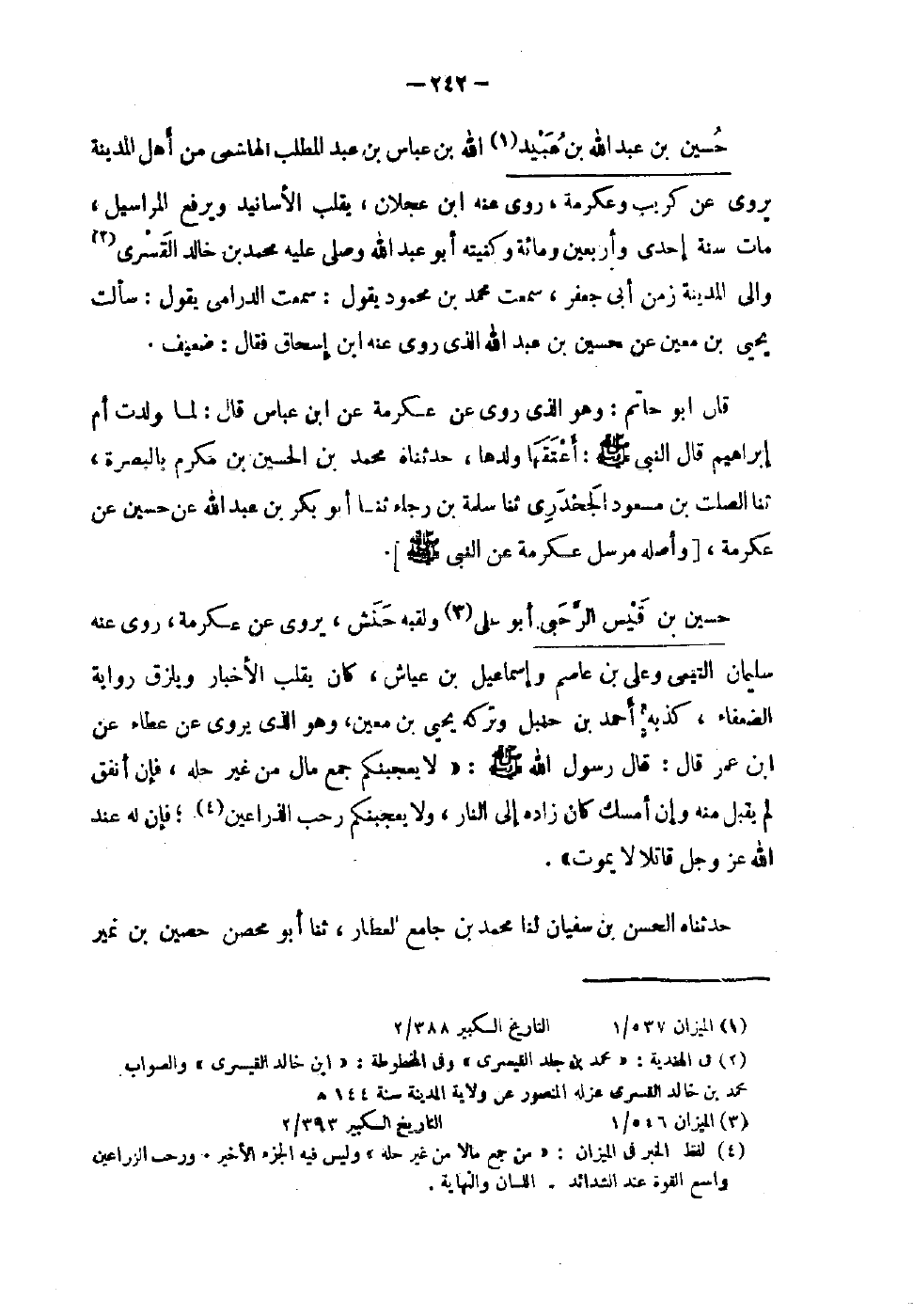 222 - حُسَيْن بْن قَيْس الرَّحبِي أَبُو عَلِي ولقبه حَنش يَرْوِي عَن عِكْرِمَة روى عَنْهُ سُلَيْمَان التَّيْمِي وَعلي بْن عَاصِم وَإِسْمَاعِيل بْن عَيَّاش كَانَ يقلب الْأَخْبَار وَيلْزق رِوَايَة الضُّعَفَاء كذبه أَحْمَد بْن حَنْبَل وَتَركه يَحْيَى بْن معِين وَهُوَ الَّذِي يَرْوِي عَنْ عَطَاءٍ عَنِ بن عُمَر قَالَ قَالَ رَسُول الله صَلَّى اللَّهُ عَلَيْهِ وَسَلَّمَ لَا يَعْجِبَنَّكُمْ جَمْعُ مَالٍ مِنْ غَيْرِ حِلِّهِ فَإِنْ أَنْفَقَ لَمْ يُقْبَلْ مِنْهُ وَإِنْ أَمْسَكَ كَانَ زَادَهُ إِلَى النَّارِ وَلا يَعْجِبَنَّكُمْ رَحْبُ الذِّرَاعَيْنِ فَإِنَّ لَهُ عِنْدَ اللَّه عَزَّ وَجَلَّ قَاتِلا لَا يَمُوتُ حَدَّثَنَاهُ الْحَسَنُ بْنُ سُفْيَانَ ثَنَا مُحَمَّدُ بْنُ جَامِعٍ الْعَطَّارُ ثَنَا أَبُو مِحْصَنٍ حُصَيْنُ بْنُ نُمَيْرٍ