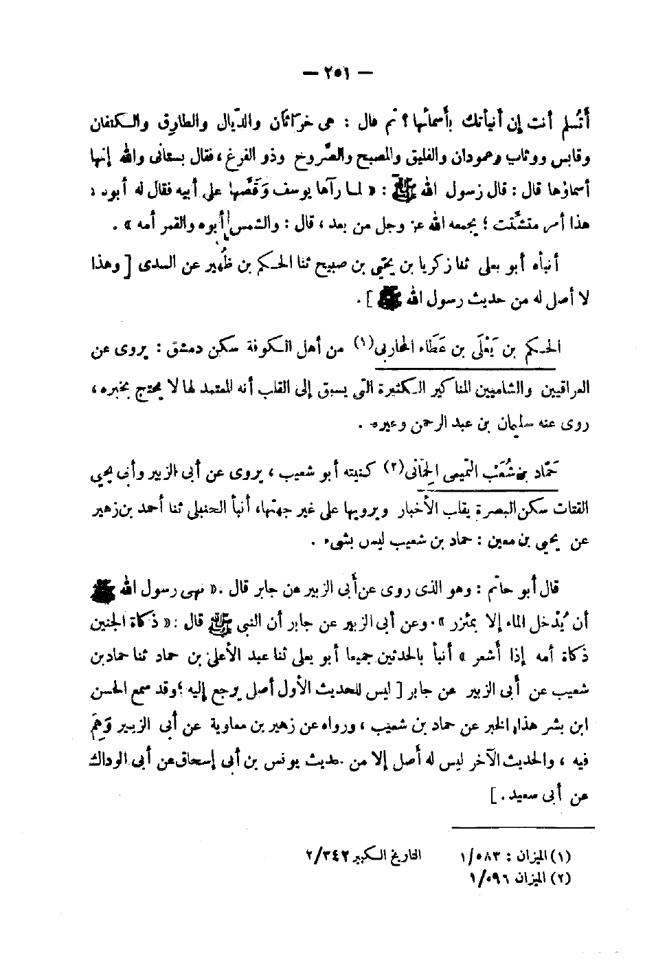 239 - حَمَّاد بْن شُعَيْب التَّمِيمِي الْحمانِي كنيته أَبُو شُعَيْب يَرْوِي عَن أَبِي الزُّبَيْر وَأبي يَحْيَى القَتَّات سكن الْبَصْرَة يقلب الْأَخْبَار ويرويها عَلَى غَيْر جِهَتهَا أنبأ الْحَنْبَلِيّ ثَنَا أَحْمَد بن زُهَيْر عَن يحيى بن معِين حَمَّاد بْن شُعَيْب لَيْسَ بِشْيَءٍ قَالَ أَبُو حَاتِم وَهُوَ وَالَّذِي رَوَى عَنْ أَبِي الزُّبَيْرِ عَنْ جَابِرٍ قَالَ نَهَى رَسُولُ اللَّهِ صَلَّى اللَّهُ عَلَيْهِ وَسَلَّمَ أَنْ يُدْخَلَ الْمَاءُ إِلا بِمِئْزَرٍ وَعَنْ أَبِي الزُّبَيْرِ عَنْ جَابِرٍ أَن النَّبِي صَلَّى اللَّهُ عَلَيْهِ وَسَلَّمَ قَالَ ذَكَاةُ الْجَنِينِ ذَكَاةُ أمه إِذا أشعر أنبأ بالحدثين جَمِيعًا أَبُو عيلى ثَنَا عَبْدُ الأَعْلَى بْنُ حَمَّادٍ ثَنَا حَمَّادُ بْنُ شُعَيْبٍ عَنْ أَبِي الزُّبَيْرِ عَنْ جَابِرٍ لَيْسَ لِلْحَدِيثِ الأَوَّلِ أَصْلٌ يُرْجَعُ إِلَيْهِ وَقَدْ سَمِعَ الْحَسَنُ بْنُ بِشْرٍ هَذَا الْخَبَرَ عَنْ حَمَّادِ بْنِ شُعَيْبٍ وَرَوَاهُ عَنْ زُهَيْرِ بْنِ مُعَاوِيَةَ عَنْ أَبِي الزُّبَيْرِ وَهُمْ فِيهِ وَالْحَدِيثُ الآخَرُ لَيْسَ لَهُ أَصْلٌ إِلَّا مِنْ حَدِيثِ يُونُسَ بنأبي إِسْحَاقَ عَنْ أَبِي الْوَدَّاكِ عَنْ أبي سعيد