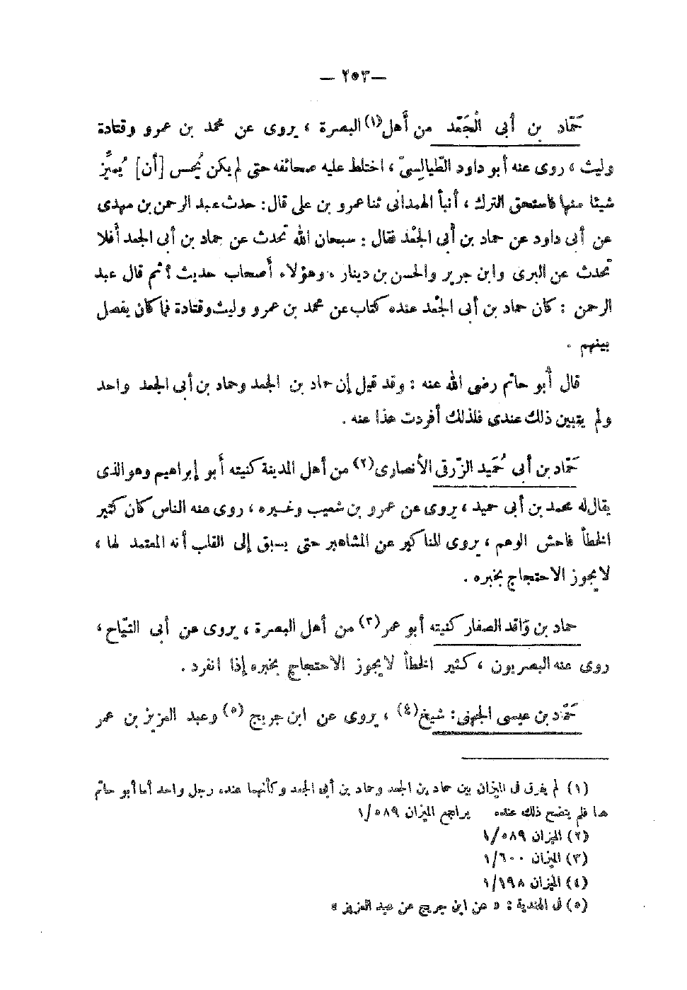 242 - حَمَّاد بْن أَبِي الْجَعْد من أهل الْبَصْرَة يَرْوِي عَن مُحَمَّد بْن عَمْرو وَقَتَادَة وَلَيْث روى عَنْهُ أَبُو دَاوُد الطَّيَالِسِيّ اخْتَلَط عَلَيْهِ صحائفه حَتَّى لَمْ يكن يحس أَن يُمَيّز شَيْئًا مِنْهَا فَاسْتحقَّ التّرْك أَنْبَأَ الْهَمْدَانِيُّ ثَنَا عَمْرُو بْنُ عَلِيٍّ قَالَ حَدَّثَ عَبْدُ الرَّحْمَنِ بْنُ مَهْدِيٍّ عَنْ أَبِي دَاوُد عَن حَمَّاد عَن أَبِي الْجَعْدِ فَقَالَ سُبْحَانَ اللَّهِ تُحَدِّثُ عَنْ حَمَّادِ بْنِ أَبِي الْجَعْدِ أَفَلا تُحَدِّثُ عَنِ الْبري وَابْنِ جَرِيرٍ وَالْحَسَنِ بْنِ دِينَارٍ وَهَؤُلاءِ أَصْحَاب حَدِيثٍ ثُمَّ قَالَ عَبْدُ الرَّحْمَنِ كَانَ حَمَّادُ بْنُ أَبِي الْجَعْدِ عِنْدَهُ كِتَابٌ عَنْ مُحَمَّدِ بْنِ عَمْرٍو وَلَيْثٍ وَقَتَادَةَ فَمَا كَانَ يَفْصِلُ بَيْنَهُمْ قَالَ أَبُو حَاتِم رَضِي الله عَنْهُ وَقَدْ قيل إِن حَمَّاد بْن الْجَعْد وَحَمَّاد بْن أَبِي الْجَعْد وَاحِد وَلَمْ يتَبَيَّن ذَلِكَ عِنْدِي فَلذَلِك أفردت هَذَا عَنهُ