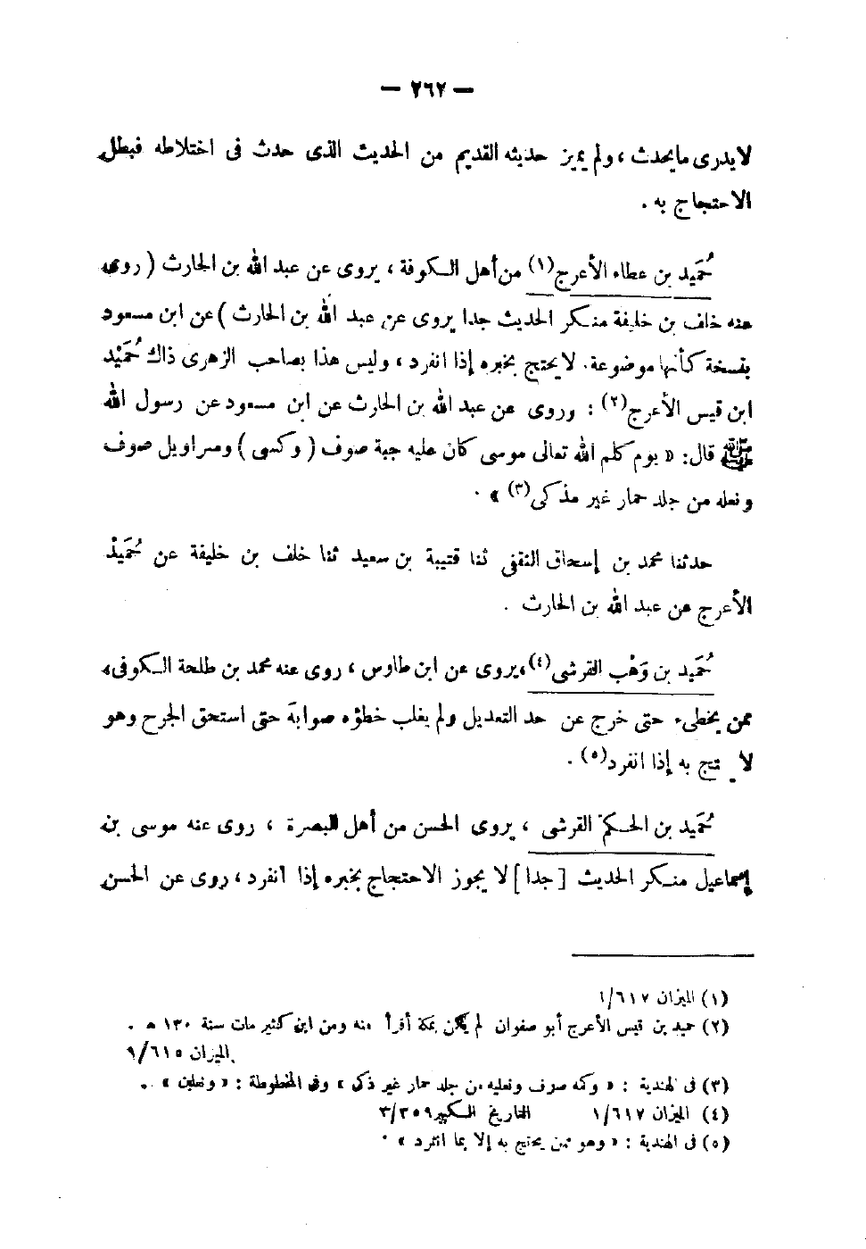 263 - حميد بْن عَطَاء الْأَعْرَج من أهل الْكُوفَة يَرْوِي عَن عَبْد اللَّهِ بْن الْحَارِث روى عَنْهُ خلف بْن خَليفَة مُنكر الْحَدِيث جدا يروي عَن عَبْد اللَّهِ بْن الْحَارِث عَن بن مَسْعُود بنسخة كَأَنَّهَا مَوْضُوعَة لَا يحْتَج بِخَبَرِهِ إِذَا انْفَرد وَلَيْسَ هَذَا بِصَاحِب الزُّهْرِيّ ذَاك حميد بْن قَيْس الْأَعْرَج وَرَوَى عَنْ عَبْد اللَّهِ بْن الْحَارِث عَن بن مَسْعُودٍ عَنْ رَسُولِ اللَّهِ صَلَّى اللَّهُ عَلَيْهِ وَسَلَّمَ قَالَ يَوْمَ كَلَّمَ اللَّهُ تَعَالَى مُوسَى كَانَ عَلَيْهِ جُبَّة صوف وكسى وَسَرَاوِيلُ صُوفٍ وَنَعْلُهُ مِنْ جِلْدِ حِمَارٍ غَيْرِ مُذَكًّى حَدَّثَنَا مُحَمَّدُ بْنُ إِسْحَاقَ الثَّقَفِيُّ ثَنَا قُتَيْبَةُ بْنُ سَعِيدٍ ثَنَا خَلَفُ بْنُ خَلِيفَةَ عَنْ حُمَيْدٍ الأَعْرَجِ عَنْ عبيد الله بن الْحَارِث