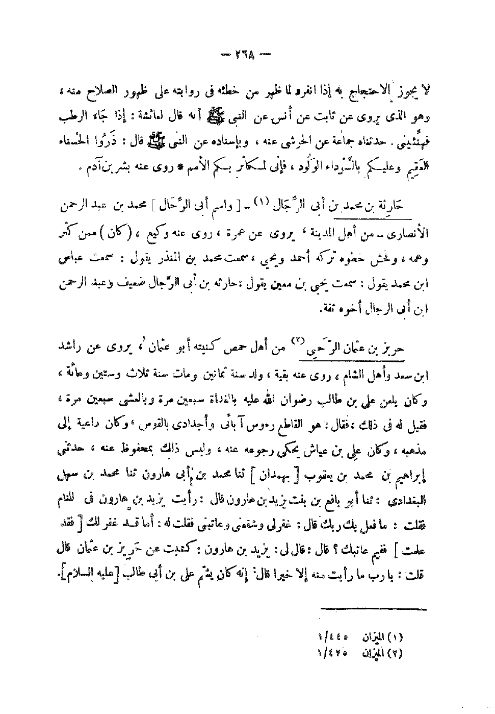 275 - حَارِثَة بْن مُحَمَّد بْن أَبِي الرِّجَال وَاسم أبي الرّحال مُحَمَّد بْن عَبْد الرَّحْمَنِ الأَنْصَارِي من أهل الْمَدِينَةِ يروي عَن عَمْرو روى عَنْهُ وَكِيع كَانَ مِمَّن كثر وهمه وفحش خطوه تَركه أَحْمَد وَيَحْيَى سَمِعْتُ مُحَمَّدَ بن الْمُنْذر يَقُول سَمِعت عَبَّاس بن مُحَمَّد يَقُول سَمِعت يحيى بْنَ مَعِينٍ يَقُولُ حَارِثَةُ بْنُ أَبِي الرِّجَالِ ضَعِيفٌ وَعَبْدُ الرَّحْمَنِ بْنُ أَبِي الرِّجَالِ أَخُوهُ ثِقَةٌ