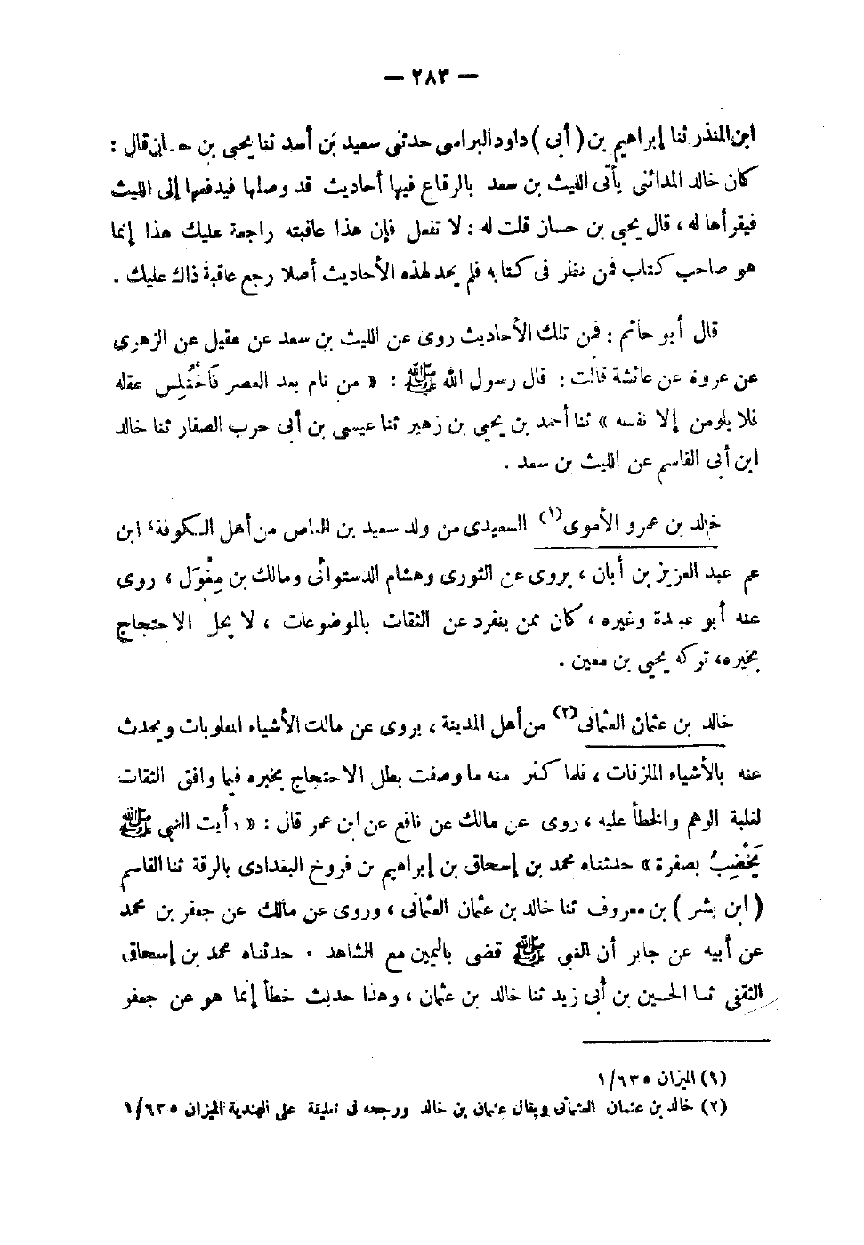 295 - خَالِد بْن عبيد الْعَتكِي من أهل الْبَصْرَة كنيته أَبُو عِصَام سكن مرو يَرْوِي عَن أَنَس بْن مَالِك روى عَنْهُ أَبُو عَاصِم والْعَلَاء بْن عمرَان وَأهل عمرَان وَأهل مرو يروي عَن أَنَس بْن مَالِك بنسخة مَوْضُوعَة مَا لَهَا أصل يعرفهَا من لَيْسَ الْحَدِيث صناعته أَنَّهَا مَوْضُوعَة مِنْهَا عَنْ أَنَسٍ عَنْ سَلْمَانَ عَن النَّبِي صَلَّى اللَّهُ عَلَيْهِ وَسَلَّمَ أَنَّهُ قَالَ لِعَلِيِّ بْنِ أَبِي طَالِبٍ عَلَيْهِ السَّلامُ هَذَا وَصِيّ مَوضِع سِرِّي وَخَيْرُ مَنْ أَتْرُكُ بَعْدِي حَدَّثَنَاهُ عَبْدُ اللَّهِ بْنُ مَحْمُودِ بْنِ سُلَيْمَانَ ثَنَا الْعَلاءُ بْنُ عِمْرَانَ عَنْهُ لَا تَحِلُّ كِتَابَةُ حَدِيثه إِلَّا عَلَى جِهَة التَّعَجُّب