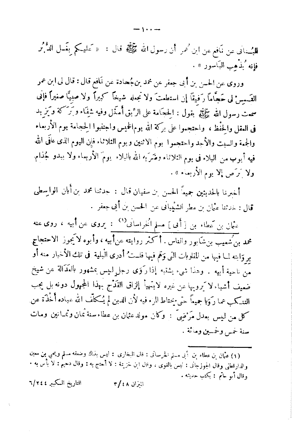 الْبنانِيّ عَن نَافِع عَن بن عُمَرَ أَنَّ رَسُولَ اللَّهِ صَلَّى اللَّهُ عَلَيْهِ وَسَلَّمَ قَالَ عَلَيْكُمْ بِغَسْلِ الدُّبُرِ فَإِنَّهُ يُذْهِبُ الْبَاسُورَ وَرَوَى عَنِ الْحَسَنِ بْنِ أَبِي جَعْفَرٍ عَنْ مُحَمَّدِ بْنِ جُحَادَةَ عَنْ نَافِعٍ قَالَ قَالَ لِي بن عمر التمس لي حجاما رفيعا إِنِ اسْتَطَعْتَ وَلا تَجْعَلْهُ شَيْخًا كَبِيرًا وَلا صَبِيًّا صَغِيرًا فَإِنِّي سَمِعْتَ رَسُولَ اللَّهِ صَلَّى اللَّهُ عَلَيْهِ وَسَلَّمَ يَقُولُ الْحِجَامَةُ عَلَى الرِّيقِ أَمْثَلُ وَفِيهِ شِفَاءٌ وَبَرَكَةٌ وَيَزِيدُ فِي الْعَقْلِ وَالْحِفْظِ وَاحْتَجِمُوا عَلَى بَرَكَةِ اللَّهِ يَوْمَ الْخَمِيسِ وَاجْتَنِبُوا الْحِجَامَةَ يَوْمَ الأَرْبِعَاءِ وَالْجُمُعَةِ وَالسَّبْتِ وَالأَحَدِ وَاحْتَجِمُوا يَوْمَ الاثْنَيْنِ وَيَوْمَ الثُّلاثَاءِ فَإِنَّ الْيَوْمَ الَّذِي عَافَى اللَّهُ فِيهِ أَيُّوبَ مِنَ الْبَلاءِ فِي يَوْمِ الثُّلاثَاءِ وَضَرَبَهُ اللَّهُ بِالْبَلاءِ يَوْمَ الأَرْبِعَاءِ وَلا يَبْدُو جُذَامٌ وَلا بَرَصٌ إِلا يَوْم الأبعاء أَخْبَرَنَا بِالْحَدِيثَيْنِ جَمِيعًا الْحَسَنُ بْنُ سُفْيَانَ قَالَ حَدَّثَنَا مُحَمَّدُ بْنُ أَبَانٍ الْوَاسِطِيُّ قَالَ حَدَّثَنَا عُثْمَانُ بْنُ مَطَرٍ الشَّيْبَانِيُّ عَنِ الْحَسَنِ بن أبي جَعْفَر