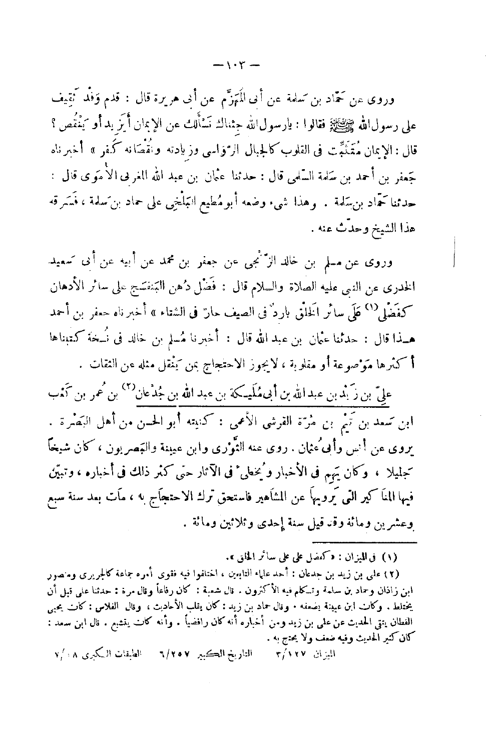 وَرَوَى عَنْ حَمَّادِ بْنِ سَلَمَةَ عَنْ أَبِي الْمُهَزّمِ عَنْ أَبِي هُرَيْرَةَ قَالَ قَدِمَ وَفْدُ ثَقِيفٍ على رَسُول الله صَلَّى اللَّهُ عَلَيْهِ وَسَلَّمَ فَقَالُوا يَا رَسُولَ اللَّهِ جِئْنَاكَ نَسْأَلُكَ عَنِ الإِيمَانِ أيزيد أَو ينقص قَالَ إِيمَان مُتَثَبِّتٌ فِي الْقُلُوبِ كَالْجِبَالِ الرَّوَاسِي وَزِيَادَتُهُ وَنُقْصَانُهُ كُفْرٌ أَخْبَرَنَاهُ جَعْفَرُ بْنُ أَحْمَدَ بْنِ سَلَمَةَ السُّلَمِيُّ قَالَ حَدَّثَنَا عُثْمَانُ بْنُ عَبْدِ اللَّهِ الْمَغْرِبِيُّ الأُمَوِيُّ قَالَ حَدَّثَنَا حَمَّادُ بْنُ سَلَمَةَ وَهَذَا شَيْءٌ وَضَعَهُ أَبُو مُطِيعٍ الْبَلْخِيُّ عَلَى حَمَّادِ بْنِ سَلَمَةَ فَسَرَقَهُ هَذَا الشَّيْخُ وَحَدَّثَ عَنْهُ وَرَوَى عَنْ مُسْلِمِ بْنِ خَالِدٍ الزَّنْجِيِّ عَنْ جَعْفَرِ بْنِ مُحَمَّدٍ عَنْ أَبِيهِ عَنْ أَبِي سَعِيدٍ الْخُدْرِيِّ عَنِ النَّبِي صَلَّى اللَّهُ عَلَيْهِ وَسَلَّمَ قَالَ فَضْلُ دُهْنِ الْبَنَفْسَجِ عَلَى سَائِرِ الأَدْهَانِ كَفَضْلِي عَلَى سَائِرِ الْخَلْقِ بَارِدٌ فِي الصَّيْفِ حَارٌّ فِي الشِّتَاءِ أَخْبَرَنَاهُ جَعْفَرُ بْنُ أَحْمَدَ هَذَا قَالَ حَدَّثَنَا عُثْمَانُ بْنُ عَبْدِ اللَّهِ قَالَ أَخْبَرَنَا مُسْلِمُ بْنُ خَالِدٍ فِي نُسْخَةٍ كَتَبْنَاهَا أَكْثَرُهَا مَوْضُوعَةٌ أَوْ مَقْلُوبَةٌ لَا يَجُوزُ الاحْتِجَاجُ بِمَنْ يَنْقُلُ مثله عَن الثِّقَات