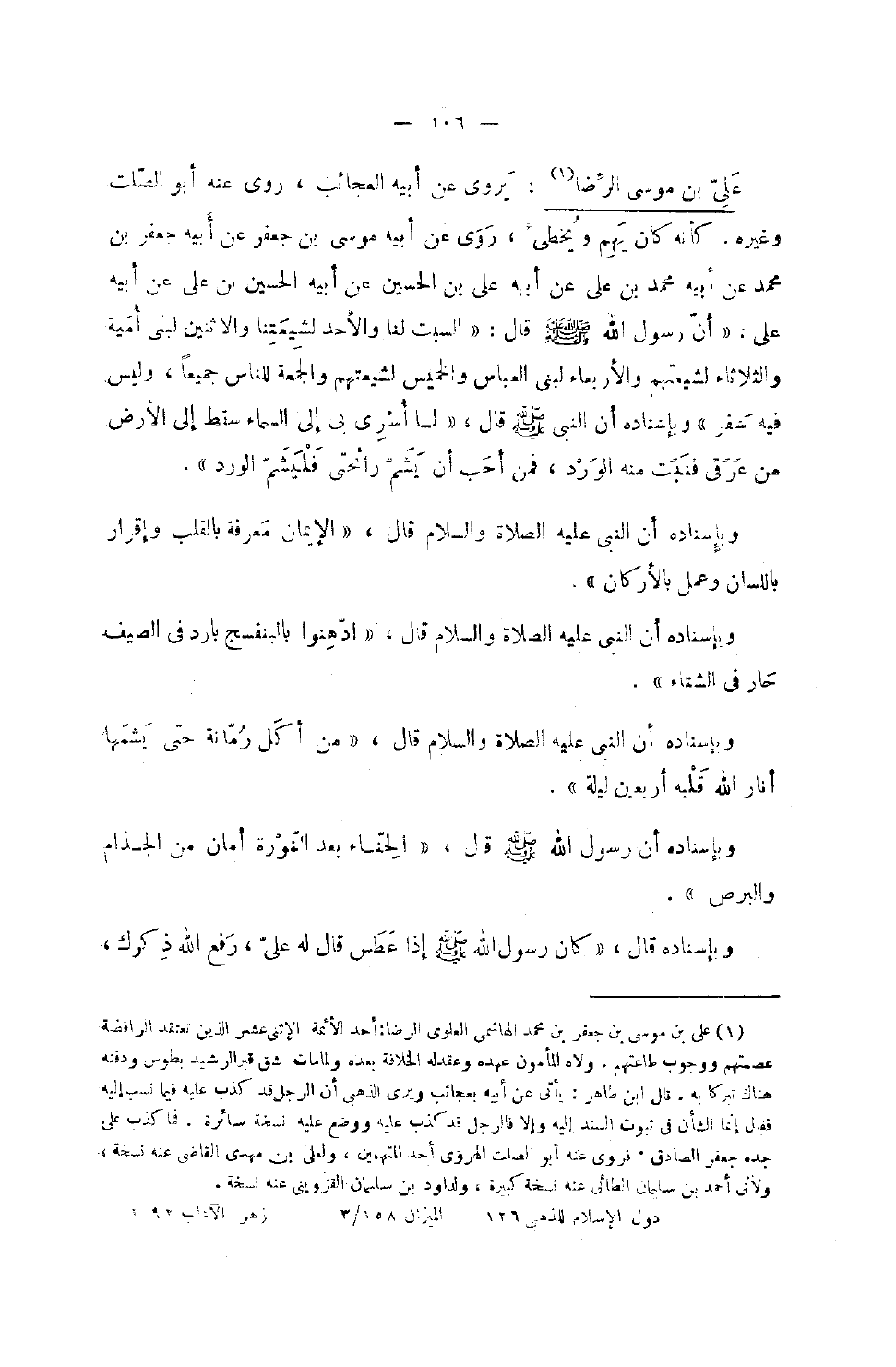 678 - عَليّ بن مُوسَى الرِّضَا يروي عَن أَبِيه الْعَجَائِب روى عَنهُ أَبُو الصَّلْت وَغَيره كَأَنَّهُ كَانَ يهم ويخطء رَوَى عَنْ أَبِيهِ مُوسَى بْنِ جَعْفَرٍ عَنْ أَبِيهِ جَعْفَرِ بْنِ مُحَمَّدٍ عَنْ أَبِيهِ مُحَمَّدِ بْنِ عَلِيٍّ عَنْ أَبِيهِ عَلِيِّ بْنِ الْحُسَيْنِ عَنْ أَبِيهِ الْحُسَيْنِ بْنِ عَلِيٍّ عَنْ أَبِيهِ عَلِيٍّ أَنَّ رَسُولُ اللَّهِ صَلَّى اللَّهُ عَلَيْهِ وَسَلَّمَ قَالَ السَّبْتُ لَنَا وَالأَحَدُ لِشِيعَتِنَا وَالإِثْنَيْنُ لِبَنِي أُمَيَّةَ وَالثُّلاثَاءُ لِشِيعَتِهِمْ وَالأَرْبِعَاءُ لِبَنِي الْعَبَّاسِ وَالْخَمِيسُ لِشِيعَتِهِمْ وَالْجُمُعَةُ لِلنَّاسِ جَمِيعًا وَلَيْسَ فِيهِ سَفَرٌ وَبِإِسْنَادِهِ أَنَّ النَّبِيَّ صَلَّى اللَّهُ عَلَيْهِ وَسَلَّمَ قَالَ لَمَّا أُسْرَي بِي إِلَى السَّمَاءِ سَقَطَ إِلَى الأَرْضِ مِنْ عَرَقِي فَنَبَتَ مِنْهُ الْوَرْدُ فَمَنْ أَحَبَّ أَنْ يَشُمَّ رَائِحَتِي فَلْيَشُمَّ الْوَرْدَ وَبِإِسْنَادِهِ أَنَّ النَّبِيَّ صَلَّى اللَّهُ عَلَيْهِ وَسلم قَالَ الإِيمَانُ مَعْرِفَةٌ بِالْقَلْبِ وَإِقْرَارٌ بِاللِّسَانِ وَعَمَلٌ بِالأَرْكَانِ وَبِإِسْنَادِهِ أَنَّ النَّبِي صَلَّى اللَّهُ عَلَيْهِ وَسَلَّمَ قَالَ ادَّهِنُوا بِالْبَنَفْسِجِ بَارِدٌ فِي الصَّيْفِ حَارٌّ فِي الشِّتَاءِ وَبِإِسْنَادِهِ أَن النَّبِي صَلَّى اللَّهُ عَلَيْهِ وَسلم قَالَ مَنْ أَكَلَ رُمَّانَةً حَتَّى يَشُمَّهَا أَنَارَ اللَّهُ قَلْبَهُ أَرْبَعِينَ لَيْلَةً وَبِإِسْنَادِهِ أَنَّ رَسُولَ اللَّهِ صَلَّى اللَّهُ عَلَيْهِ وَسَلَّمَ قَالَ الْحِنَّاءُ بَعْدَ النَّوْرَةِ أَمَانٌ مِنَ الْجُذَامِ وَالْبَرَصِ وَبِإِسْنَادِهِ قَالَ كَانَ رَسُولُ اللَّهِ صَلَّى اللَّهُ عَلَيْهِ وَسَلَّمَ إِذَا عَطَسَ قَالَ لَهُ عَليّ رفع الله ذكرك
