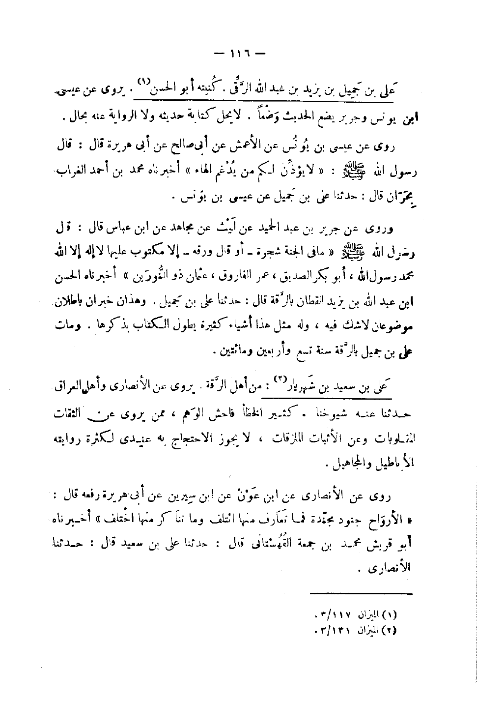 697 - عَليّ بن جميل بن يزِيد بن عبد الله الرقي كنيته أَبُو الْحسن يروي عَن عِيسَى بن يُونُس وَجَرِير يضع الحَدِيث وضعا لَا يحل كِتَابَة حَدِيثه وَلَا الرِّوَايَة عَنْهُ بِحَال رَوَى عَنْ عِيسَى بْنِ يُونُسَ عَنِ الأَعْمَشِ عَنْ أَبِي صَالِحٍ عَنْ أَبِي هُرَيْرَةَ قَالَ قَالَ رَسُولُ اللَّهِ صَلَّى اللَّهُ عَلَيْهِ وَسَلَّمَ لَا يُؤَذِّنْ لَكُمْ مَنْ يُدْغِمُ الْهَاءَ أَخْبَرَنَاهُ مُحَمَّدُ بْنُ أَحْمَدَ الضَّرَّابُ بِحَرَّانَ قَالَ حَدَّثَنَا عَلِيُّ بْنُ جَمِيلٍ عَنْ عِيسَى بْنِ يُونُسَ وَرَوَى عَنْ جَرِيرِ بْنِ عَبْدِ الْحَمِيدِ عَنْ لَيْثٍ عَنْ مُجَاهِدٍ عَن بن عَبَّاسٍ قَالَ قَالَ رَسُولُ اللَّهِ صَلَّى اللَّهُ عَلَيْهِ وَسَلَّمَ مَا فِي الْجَنَّةِ شَجَرَةٌ أَوْ قَالَ وَرَقَةٌ إِلا مَكْتُوبٌ عَلَيْهَا لَا إِلَهَ إِلا اللَّهُ مُحَمَّدٌ رَسُولُ اللَّهِ أَبُو بَكْرٍ الصِّدِّيقُ عُمَرُ الْفَارُوقُ عُثْمَانُ ذُو النُّورَيْنِ أَخْبَرَنَاهُ الْحُسَيْن بن عبد الله بن زيد الْقَطَّانُ بِالرَّقَّةِ قَالَ حَدَّثَنَا عَلِيُّ بن حميل وَهَذَانِ خبران باطلان موضعان لَا شَكَّ فِيهِ وَلَهُ مِثْلَ هَذَا أَشْيَاءُ كَثِيرَةٌ يَطُولُ الْكِتَابُ بِذِكْرِهَا وَمَاتَ عَلِيُّ بْنُ جَمِيلٍ بالرقة سنة تسع وَأَرْبَعين وَمِائَتَيْنِ