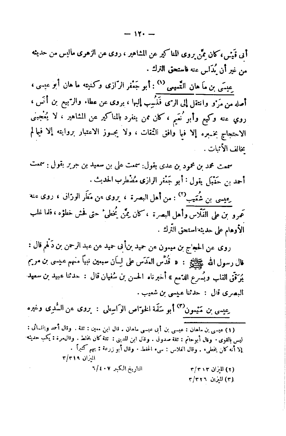 706 - عِيسَى بن ماهان التَّمِيمِي أَبُو جَعْفَر الرَّازِيّ وكنيته ماهان أَبُو عِيسَى أَصله من مرو وانتقل إِلَى الرّيّ فنسب إِلَيْهَا يروي عَن عَطاء وَالربيع بن أنس روى عَنهُ وَكِيع وَأَبُو نعيم كَانَ مِمَّن ينْفَرد بِالْمَنَاكِيرِ عَن الْمَشَاهِير لَا يُعجبنِي الِاحْتِجَاج بِخَبَرِهِ إِلَّا فِيمَا وَافق الثِّقَات وَلَا يجوز الِاعْتِبَار بروايته إِلَّا فِيمَا لم يُخَالف الْأَثْبَات سَمِعْتُ مُحَمَّدَ بْنَ مَحْمُودِ بْنِ عَدِيٍّ يَقُولُ سَمِعْتُ عَلِيَّ بْنَ سَعِيدِ بْنِ جَرِيرٍ يَقُولُ سَمِعْتُ أَحْمَدَ بْنَ حَنْبَلٍ يَقُولُ أَبُو جَعْفَر الرَّازِيّ مُضْطَرب الحَدِيث