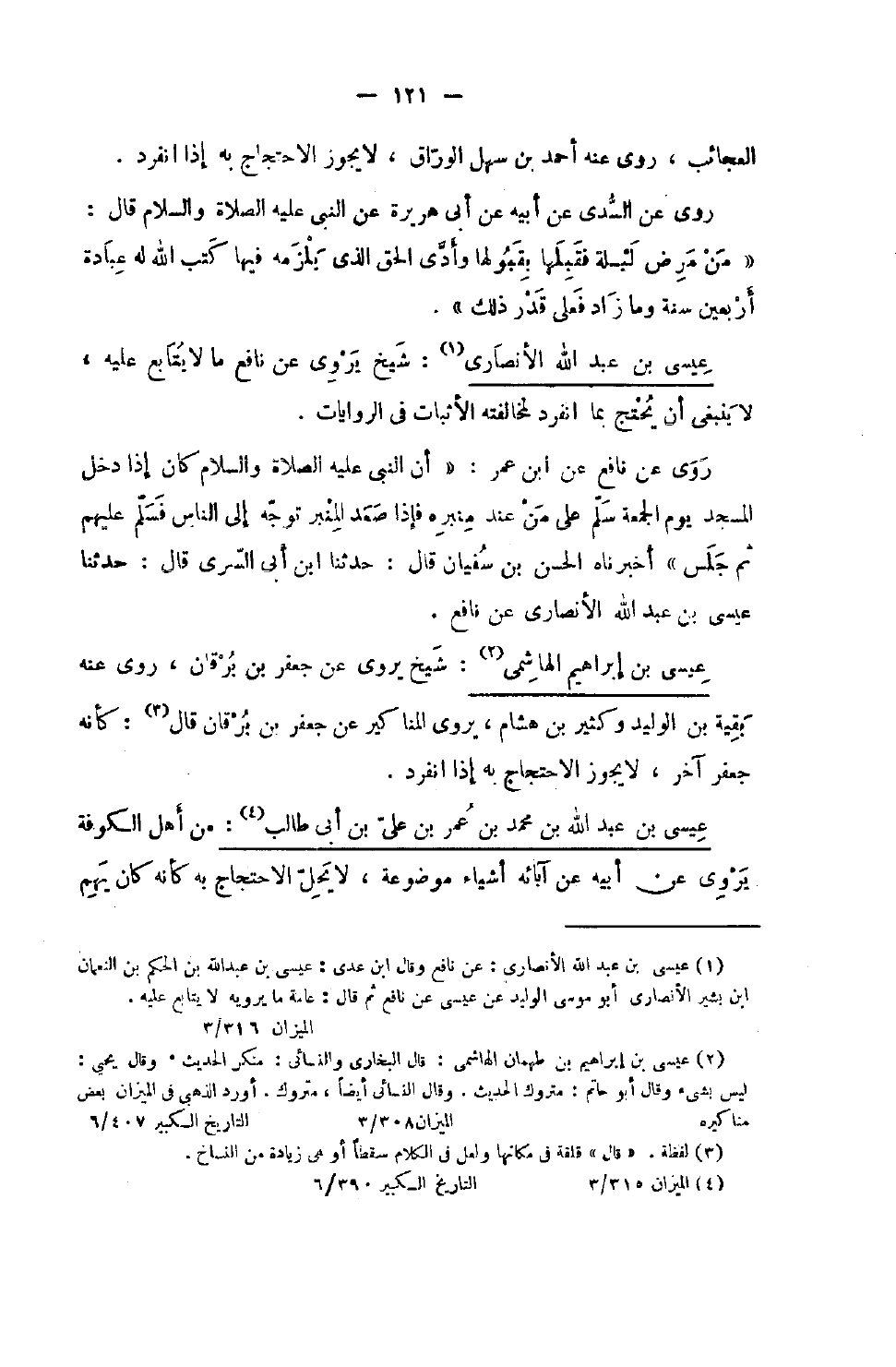 709 - عِيسَى بن عبد الله الْأنْصَارِيّ شيخ يروي عَن نَافِع مَا لَا يُتَابع عَلَيْهِ لَا يَنْبَغِي أَن يحْتَج بِمَا انْفَرد لمُخَالفَته الْأَثْبَات فِي الرِّوَايَات روى عَن نَافِع عَن بن عُمَرَ أَنَّ النَّبِيَّ صَلَّى اللَّهُ عَلَيْهِ وَسلم كَانَ إِذَا دَخَلَ الْمَسْجِدَ يَوْمَ الْجُمُعَةِ سَلَّمَ عَلَى مَنْ عِنْدَ مِنْبَرِهِ فَإِذَا صَعِدَ الْمِنْبَرَ تَوَجَّهَ إِلَى النَّاسِ فَسَلَّمَ عَلَيْهِمْ ثُمَّ جَلَسَ أَخْبَرَنَاهُ الْحَسَنُ بْنُ سُفْيَانَ قَالَ حَدثنَا بن أبي السّري قَالَ حَدثنَا عِيسَى بن عبد الله الْأنْصَارِيّ عَن نَافِع