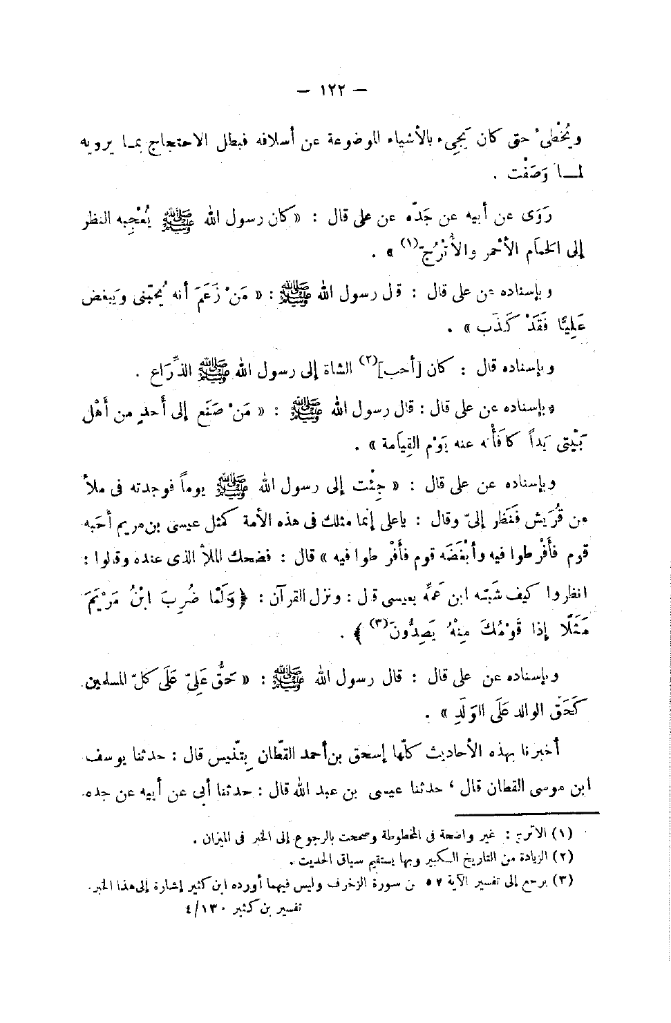 ويخطيء حَتَّى كَانَ يَجِيء بالأشياء الْمَوْضُوعَة عَن أسلافه فَبَطل الِاحْتِجَاج بِمَا يرويهِ لما وصفت رَوَى عَنْ أَبِيهِ عَنْ جَدِّهِ عَنْ عَلِيٍّ قَالَ كَانَ رَسُولُ اللَّهِ صَلَّى اللَّهُ عَلَيْهِ وَسَلَّمَ يُعْجِبُهُ النَّظَرُ إِلَى الْحَمَامِ الأَحْمَرِ وَالأُتْرُجِّ وَبِإِسْنَادِهِ عَنْ عَلِيٍّ قَالَ قَالَ رَسُولُ اللَّهِ صَلَّى اللَّهُ عَلَيْهِ وَسَلَّمَ من زعم أَنه يجبني وَيَبْغَضُ عَلِيًّا فَقَدْ كَذَبَ وَبِإِسْنَادِهِ قَالَ كَانَ أَحَبُّ الشَّاةِ إِلَى رَسُولُ اللَّهِ صَلَّى اللَّهُ عَلَيْهِ وَسَلَّمَ الذِّرَاعَ وَبِإِسْنَادِهِ عَنْ عَلِيٍّ قَالَ قَالَ رَسُولُ اللَّهِ صَلَّى اللَّهُ عَلَيْهِ وَسَلَّمَ مَنْ صَنَعَ إِلَى أَحَدٍ مِنْ أَهْلِ بَيْتِي يَدًا كَافَأْتُهُ عَنْهُ يَوْمَ الْقِيَامَةِ وَبِإِسْنَادِهِ عَنْ عَلِيٍّ قَالَ جِئْتُ إِلَى رَسُول الله صَلَّى اللَّهُ عَلَيْهِ وَسَلَّمَ يَوْمًا فَوَجَدْتُهُ فِي مَلأ مِنْ قُرَيْشٍ فَنَظَرَ إِلَيَّ وَقَالَ يَا عَليّ إِنَّمَا تِلْكَ فِي هَذِهِ الأُمَّةِ كَمَثَلِ عِيسَى بن مَرْيَمَ أَحَبَّهُ قَوْمٌ فَأَفْرَطُوا فِيهِ وَأَبْغَضَهُ قَوْمٌ فَأَفْرَطُوا فِيهِ قَالَ فَضَحِكَ الْمَلأُ الَّذِي عِنْدَهُ وَقَالُوا انْظُرُوا كَيفَ شبه بن عَمِّهِ بِعِيسَى قَالَ وَنَزَلَ الْقُرْآنُ وَلما ضرب بن مَرْيَمَ مَثَلا إِذَا قَوْمُكَ مِنْهُ يصدون وَبِإِسْنَادِهِ عَنْ عَلِيٍّ قَالَ قَالَ رَسُولُ اللَّهِ صَلَّى اللَّهُ عَلَيْهِ وَسَلَّمَ حَقُّ عَلِيٍّ عَلَى كُلِّ الْمُسْلِمِينَ كَحَقِّ الْوَالِدِ عَلَى الْوَلَدِ أَخْبَرَنَا بِهَذِهِ الأَحَادِيثَ كُلَّهَا إِسْحَاقُ بن أَحْمد الْقطَّان بتنيس قَالَ حَدَّثَنَا يُوسُفُ بْنُ مُوسَى الْقَطَّانُ قَالَ حَدَّثَنَا عِيسَى بْنُ عَبْدِ اللَّهِ قَالَ حَدَّثَنَا أَبِي عَنْ أَبِيه عَن جده