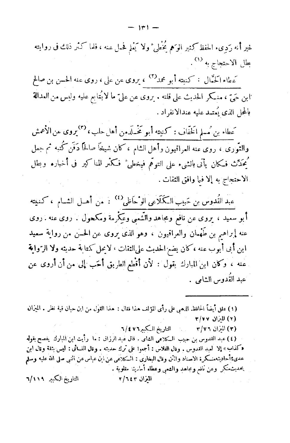 727 - عَطاء بن مُسلم الْخفاف كنيته أَبُو مخلد من أهل حلب يروي عَن الْأَعْمَش وَالثَّوْري روى عَنهُ الْعِرَاقِيُّونَ وَأهل الشَّام كَانَ شَيخا صَالحا دفن كتبه ثمَّ جعل يحدث فَكَانَ يَأْتِي بالشَّيْء على التَّوَهُّم فيخطيء فَكثر الْمَنَاكِير فِي أخباره وَبَطل الِاحْتِجَاج بِهِ إِلَّا فِيمَا وَافق الثِّقَات
