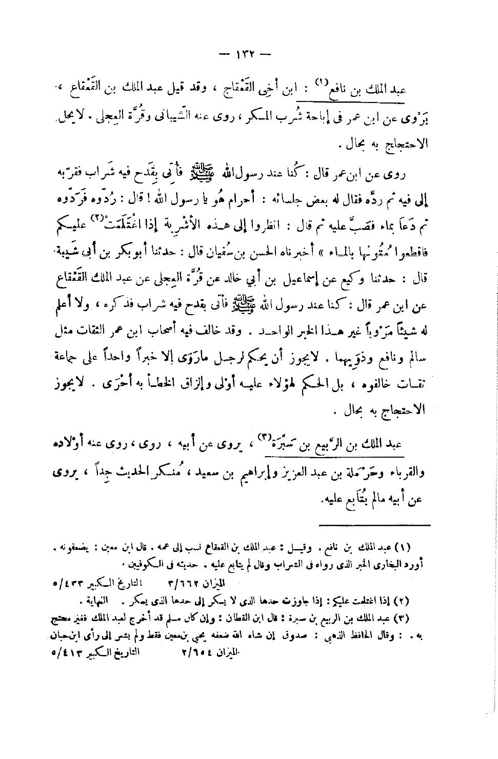 729 - عبد الْملك بن نَافِع بن أخي الْقَعْقَاع وَقد قيل عبد الْملك بن الْقَعْقَاع يروي عَن بن عمر فِي إِبَاحَة شرب الْمُسكر روى عَنهُ الشَّيْبَانِيّ وقرة الْعجلِيّ لَا يحل الِاحْتِجَاج بِهِ بِحَال روى عَن بْنُ عُمَرَ قَالَ كُنَّا عِنْدَ رَسُولُ اللَّهِ صَلَّى اللَّهُ عَلَيْهِ وَسلم فَأتى بقدح فِيهِ شراب فقربه إِلَى فِيهِ ثمَّ رده فَقَالَ لَهُ بعض جُلَسَائِهِ أحرام هُوَ يَا رَسُول الله قَالَ ردُّوهُ فَردُّوهُ ثمَّ دَعَا بِمَاء فصب عَلَيْهِ ثمَّ قَالَ انْظُرُوا إِلَى هَذِه الْأَشْرِبَة إِذا اغتلمت عَلَيْكُم فَاقْطَعُوا متونها بِالْمَاءِ أخبرناه الْحسن بْنُ سُفْيَانَ قَالَ حَدَّثَنَا أَبُو بَكْرِ بْنُ أَبِي شَيْبَةَ قَالَ حَدثنَا وَكِيع عَن إِسْمَاعِيل بن أبي خَالِد عَن قُرَّة الْعجلِيّ عَن عبد الْملك الْقَعْقَاع عَن بْنُ عُمَرَ قَالَ كُنَّا عِنْدَ رَسُولُ اللَّهِ صَلَّى اللَّهُ عَلَيْهِ وَسلم فَأتى بقدح فِيهِ شراب فَذكره وَلَا أعلم لَهُ شَيْئا مرويا غير هَذَا الْخَبَر وَالْوَاحد وَقد خَالف فِيهِ أَصْحَاب بن عمر الثِّقَات مثل سَالم وَنَافِع وذويهما لَا يجوز أَن يحكم لرجل مَا روى إِلَّا خَبرا وَاحِدًا على جمَاعَة ثِقَات خالفوه بل الحكم لهَؤُلَاء عَلَيْهِ أولى وإلزاق الْخَطَأ بِهِ أَحْرَى لَا يجوز الِاحْتِجَاج بِهِ بِحَال