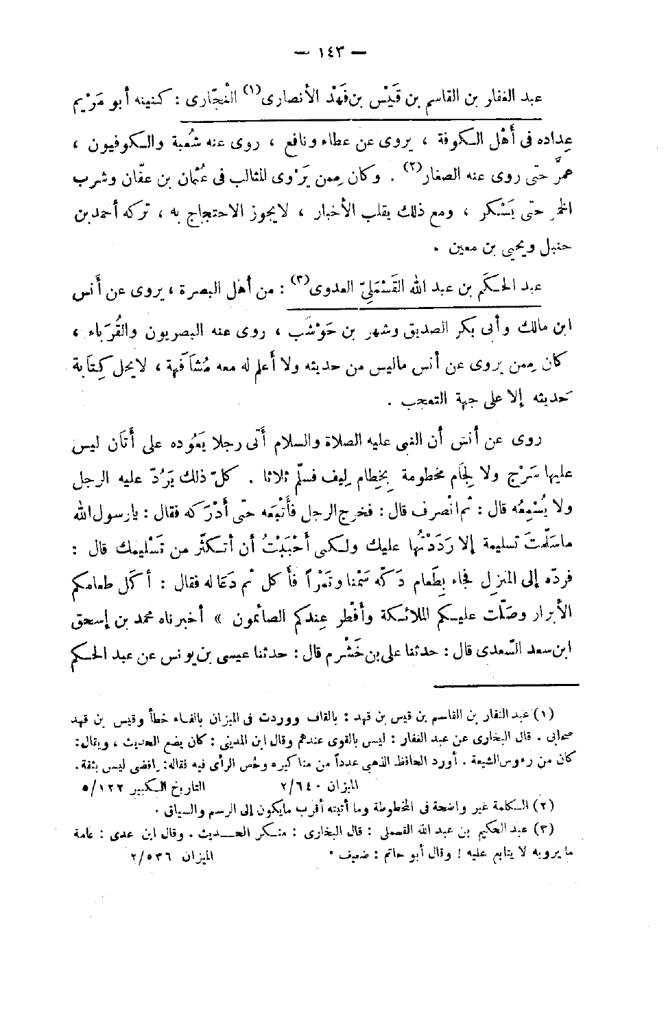750 - عبد الحكم بن عبد الله الْقَسْمَلِي الْعَدوي من أهل الْبَصْرَة يَرْوِي عَن أَنَس بْن مَالك وَأبي بكر الصّديق وَشهر بن حَوْشَب روى عَنهُ البصريون والقرباء كَانَ مِمَّن يروي عَن أنس مَا لَيْسَ من حَدِيثه وَلَا أعلم لَهُ مَعَه مشافهة لَا يحل كِتَابَة حَدِيثه إِلَّا عَلَى جِهَة التَّعَجُّب رَوَى عَنْ أَنَسٍ أَنَّ النَّبِيَّ صَلَّى اللَّهُ عَلَيْهِ وَسلم أَتَى رجلا يعودهُ على أتان لَيْسَ عَلَيْهَا سرج وَلَا لجام مخطومة بِخِطَام لِيف فَسلم ثَلَاثًا كل ذَلِك يرد عَلَيْهِ الرجل وَلَا يسمعهُ قَالَ ثمَّ انْصَرف قَالَ فَخرج الرجل فَأتبعهُ حَتَّى أدْركهُ فَقَالَ يَا رَسُول الله مَا سلمت تسلمية إِلَّا رَددتهَا عَلَيْك وَلَكِنِّي أَحْبَبْت أَن أتكثر من تسليمك قَالَ فَرده إِلَى الْمنزل فجَاء بِطَعَام دكه سمنا وَتَمْرًا فَأكل ثمَّ دَعَا لَهُ فَقَالَ أكل طَعَامكُمْ الْأَبْرَار وصلت عَلَيْكُم الْمَلَائِكَة وَأفْطر عنْدكُمْ الصائمون أخبرناه مُحَمَّد بن إِسْحَاق بن سعد السَّعْدِيّ قَالَ حَدَّثَنَا عَلِيُّ بْنُ خَشْرَمٍ قَالَ حَدَّثَنَا عِيسَى بْنُ يُونُسَ عَنْ عبد الحكم
