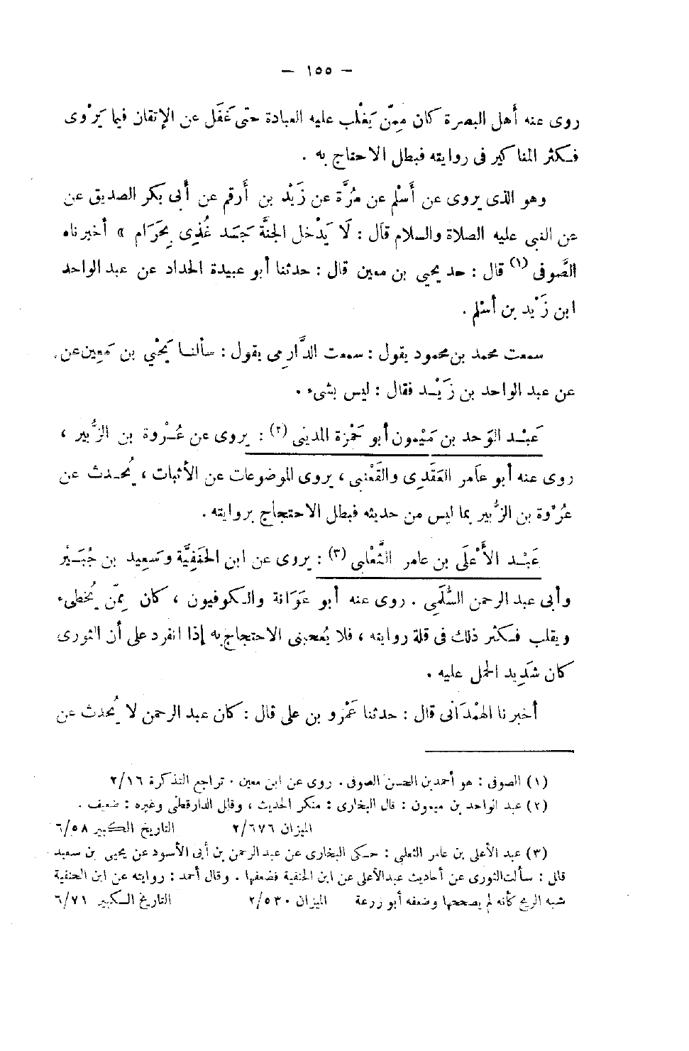 روى عَنْهُ أهل الْبَصْرَة كَانَ مِمَّن يغلب عَلَيْهِ الْعِبَادَة حَتَّى غفل عَن الإتقان فِيمَا يروي فَكثر الْمَنَاكِير فِي رِوَايَته فَبَطل الأحتاج بِهِ وَهُوَ الَّذِي يَرْوِي عَنْ أَسْلَمَ عَنْ مُرَّةَ عَنْ زَيْدِ بْنِ أَرْقَمَ عَنْ أَبِي بَكْرٍ الصِّدِّيقِ عَنِ النَّبِيِّ صَلَّى اللَّهُ عَلَيْهِ وَسَلَّمَ قَالَ لَا يَدْخُلُ الْجَنَّةَ جَسَدٌ غُذِّيَ بِحَرَامٍ أَخْبَرَنَاهُ الصُّوفِيُّ قَالَ حَدَّثَنَا يَحْيَى بْنُ معِين قَالَ حَدثنَا أَبُو عبيد الْحَدَّادُ عَنْ عَبْدِ الْوَاحِدِ بْنِ زَيْدٍ عَنْ أَسْلَمَ سَمِعت مُحَمَّد بْنَ مَحْمُودٍ يَقُولُ سَمِعْتُ الدَّارِمِيَّ يَقُول سَأَلنَا يحيى بن معِين عَنْ عَبْدِ الْوَاحِدِ بْنِ زَيْدٍ فَقَالَ لَيْسَ بِشَيْء