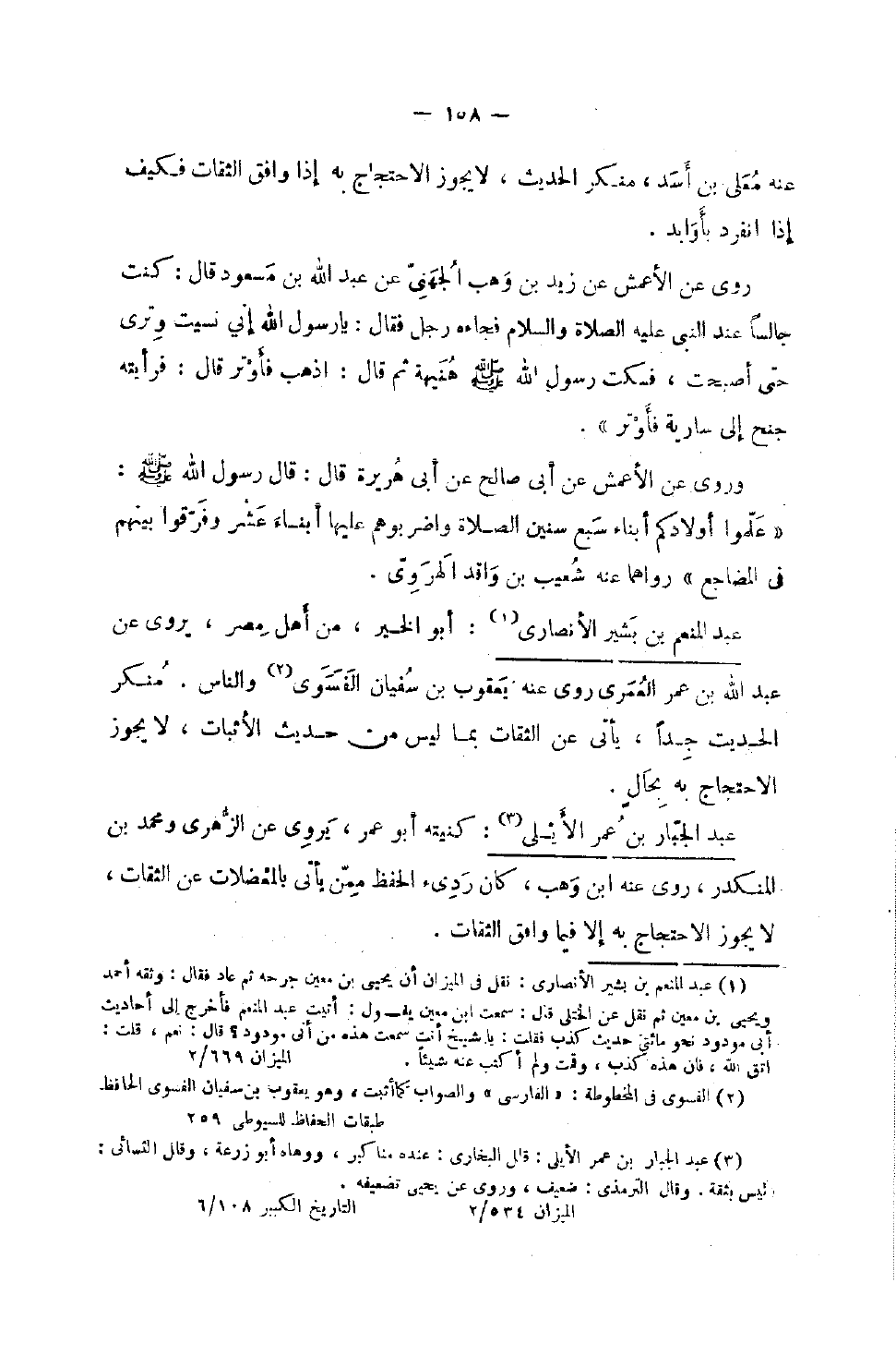 عَنهُ مُعلى بن أَسد مُنكر الْحَدِيث لَا يَجُوز الِاحْتِجَاج بِهِ إِذَا وَافق الثِّقَات فَكيف إِذَا انْفَرد بأوابد رَوَى عَنِ الأَعْمَشِ عَنْ زَيْدِ بْنِ وَهْبٍ الْجُهَنِيِّ عَنْ عَبْدِ اللَّهِ بْنِ مَسْعُودٍ قَالَ كُنْتُ جَالِسًا عِنْدَ النَّبِيِّ صلى الله عَلَيْهِ وَسلم فَجَاءَهُ رَجُلٌ فَقَالَ يَا رَسُولَ اللَّهِ إِنِّي نَسِيتُ وِتْرِي حَتَّى أَصْبَحْتُ فَسَكَتَ رَسُولُ اللَّهِ صَلَّى اللَّهُ عَلَيْهِ وَسَلَّمَ هُنَيْهَةً ثُمَّ قَالَ اذْهَبْ فَأَوْتِرْ قَالَ فَرَأَيْتُهُ جَنَحَ إِلَى سَارِيَةٍ فَأَوْتَرَ وَرَوَى عَنِ الأَعْمَشِ عَنْ أَبِي صَالِحٍ عَنْ أَبِي هُرَيْرَةَ قَالَ قَالَ رَسُولُ اللَّهِ صَلَّى اللَّهُ عَلَيْهِ وَسَلَّمَ عَلِّمُوا أَوْلادَكُمْ أَبْنَاءَ سَبْعِ سِنِينَ الصَّلاةَ وَاضْرِبُوهُمْ عَلَيْهَا أَبْنَاءَ عَشْرٍ وَفَرِّقُوا بَيْنَهُمْ فِي الْمَضَاجِعِ رَوَاهُمَا عَنْهُ شُعَيْبُ بْنُ وَاقِدٍ الْهَرَوِيّ
