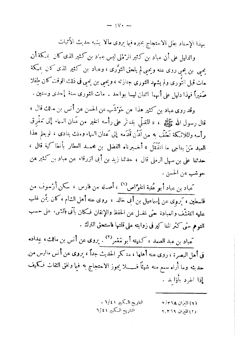 بِهَذَا الْإِسْنَاد بَطل الِاحْتِجَاج بِخَبَرِهِ فِيمَا يروي مَالا يشبه حَدِيث الْأَثْبَات وَالدَّلِيل على أَن عباد بن كثير الرَّمْلِيّ لَيْسَ بعباد بن كثير الَّذِي كَانَ بِمَكَّة أَن يحيى بن يحيى روى عَنهُ وَيحيى لم يلْحق الثَّوْريّ وَعباد بن كثير الَّذِي كَانَ بِمَكَّة مَاتَ قبل الثَّوْريّ وَلم يشْهد الثَّوْريّ جنَازَته وَيحيى بن يحيى فِي ذَلِك الْوَقْت كَانَ طفْلا صَغِيرا فَهَذَا دَلِيل على أَنَّهُمَا اثْنَان ليسَا بِوَاحِد مَاتَ الثَّوْريّ سنة إِحْدَى وَسِتِّينَ وَقَدْ رَوَى عَبَّادُ بْنُ كَثِيرٍ هَذَا عَنْ حَوْشَبٍ عَنِ الْحَسَنِ عَنْ أَنَسِ بْنِ مَالِكٍ قَالَ قَالَ رَسُولُ اللَّهِ صَلَّى اللَّهُ عَلَيْهِ وَسَلَّمَ الْمُصَلِّي يَتَنَاثَرُ عَلَى رَأْسِهِ الْخَيْرُ مِنْ عَنَانِ السَّمَاءِ إِلَى مِفْرَقِ رَأْسِهِ وَالْمَلَائِكَةُ تَحُفُّ بِهِ مِنْ لَدُنْ قَدَمِهِ إِلَى عَنَانِ السَّمَاءِ وَمَلَكٌ يُنَادِي لَوْ يَعْلَمُ هَذَا الْعَبْدُ مَنْ يُنَاجِي مَا انْفَتَلَ أَخْبَرَنَاهُ الْفَضْلُ بْنُ مُحَمَّدٍ الْعَطَّارُ بِأَنْطَاكِيَةَ قَالَ حَدَّثَنَا عَلِيُّ بْنُ سَهْلٍ الرَّمْلِيُّ قَالَ حَدَّثَنَا زَيْدُ بْنُ أَبِي الزَّرْقَاءِ عَنْ عَبَّادِ بْنِ كَثِيرٍ عَن حَوْشَب عَن الْحسن
