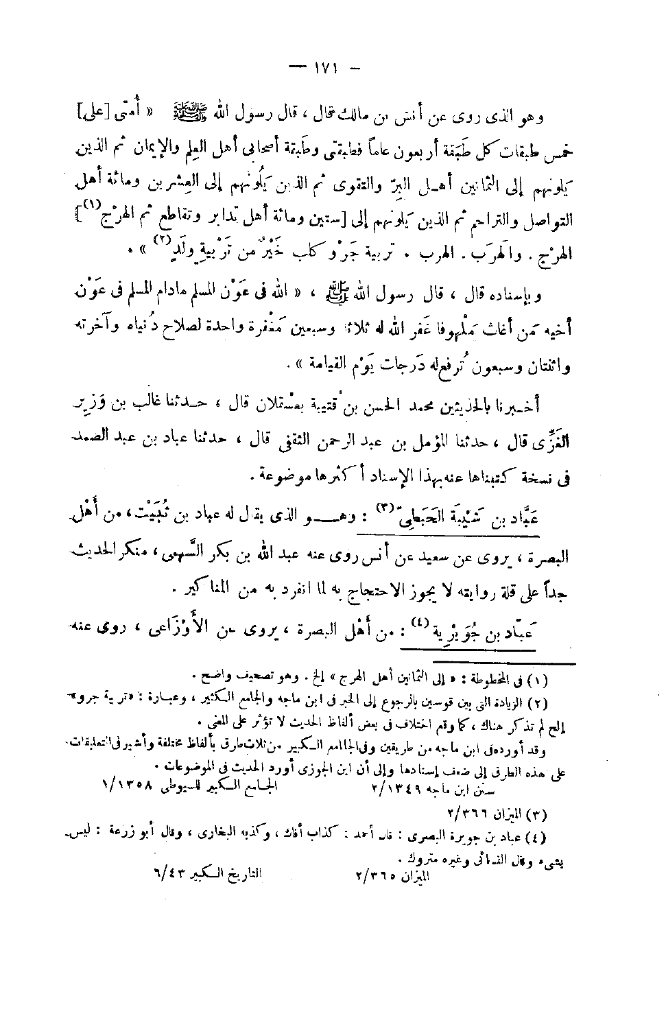 وَهُوَ الَّذِي رَوَى عَنْ أَنَسِ بْنِ مَالِكٍ قَالَ قَالَ رَسُولُ اللَّهِ صَلَّى اللَّهُ عَلَيْهِ وَسَلَّمَ أُمَّتِي عَلَى خَمْسِ طَبَقَاتٍ كُلُّ طَبَقَةٍ أَرْبَعُونَ عَامًا فَطَبَقَتِي وَطَبَقَةُ أَصْحَابِي أَهْلُ الْعِلْمِ وَالإِيمَانِ ثُمَّ الَّذِينَ يَلُونَهُمْ إِلَى الثَّمَانِينَ أَهْلُ الْبِرِّ وَالتَّقْوَى ثُمَّ الَّذِينَ يَلُونَهُمْ إِلَى الْعِشْرِينَ وَمِائَةٍ أَهْلُ التَّوَاصُلِ وَالتَّرَاحُمِ ثُمَّ الَّذِينَ يَلُونَهُمْ إِلَى سِتِّينَ وَمِائَةٍ أَهْلُ تَدَابُرٍ وَتَقَاطُعٍ ثُمَّ الْهَرْجُ الْهَرْجُ وَالْهَرَبُ وَالْهَرَبُ تَرْبِيَةُ جَرْوِ كَلْبٍ خَيْرٌ مِنْ تَرْبِيَةِ وَلَدٍ وَبِإِسْنَادِهِ قَالَ قَالَ رَسُولُ اللَّهِ صَلَّى اللَّهُ عَلَيْهِ وَسَلَّمَ اللَّهُ فِي عَوْنِ الْمُسْلِمِ مَا دَامَ الْمُسْلِمُ فِي عَوْنِ أَخِيهِ مَنْ أَغَاثَ مَلْهُوفًا غَفَرَ اللَّهُ لَهُ ثَلاثًا وَسَبْعِينَ مَغْفِرَةً وَاحِدَةٌ لِصَلاحِ دُنْيَاهُ وَآخِرَتِهِ وَاثْنَتَانِ وَسَبْعُونَ تَرْفَعُ لَهُ دَرَجَاتٍ يَوْمَ الْقِيَامَةِ أَخْبَرَنَا بِالْحَدِيثَيْنِ مُحَمَّدٌ الْحَسَنُ بْنِ قُتَيْبَةَ بِعَسْقَلانَ قَالَ حَدَّثَنَا غَالِبُ بْنُ وَزِيرٍ الْغَزِّيُّ قَالَ حَدَّثَنَا الْمُؤَمَّلُ بْنُ عَبْدِ الرَّحْمَنِ الثَّقَفِيُّ قَالَ حَدَّثَنَا عَبَّادُ بْنُ عَبْدِ الصَّمَدِ فِي نُسْخَةٍ كَتَبْنَاهَا عَنْهُ بِهَذَا الإِسْنَادِ أَكْثَرُهَا مَوْضُوعَةٌ