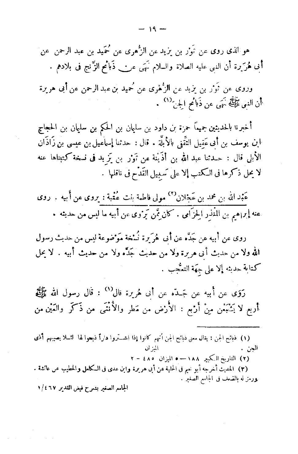546 - عبد الله بن مُحَمَّد بن عجلَان مولى فَاطِمَة بنت عتبَة يروي عَن أَبِيهِ روى عَنْهُ إِبْرَاهِيم بْن الْمُنْذر الْحزَامِي كَانَ مِمَّن يروي عَن أَبِيه مَا لَيْسَ من حَدِيثه روى عَن أَبِيه عَن جده عَن أبي هُرَيْرَة نُسْخَة مَوْضُوعَة لَيْسَ من حَدِيث رَسُول الله وَلَا من حَدِيث أبي هُرَيْرَة وَلَا من حَدِيث جده وَلَا من حَدِيث أَبِيه لَا يحل كِتَابَة حَدِيثه إِلَّا عَلَى جِهَة التَّعَجُّب رَوَى عَنْ أَبِيهِ عَنْ جَدِّهِ عَنْ أَبِي هُرَيْرَةَ قَالَ قَالَ رَسُولُ اللَّهِ صَلَّى اللَّهُ عَلَيْهِ وَسَلَّمَ أَرْبَعٌ لَا يَشْبَعْنَ مِنْ أَرْبَعٍ الأَرْضُ مِنْ مَطَرٍ وَالأُنْثَى مِنْ ذَكَرٍ وَالْعَيْنُ من