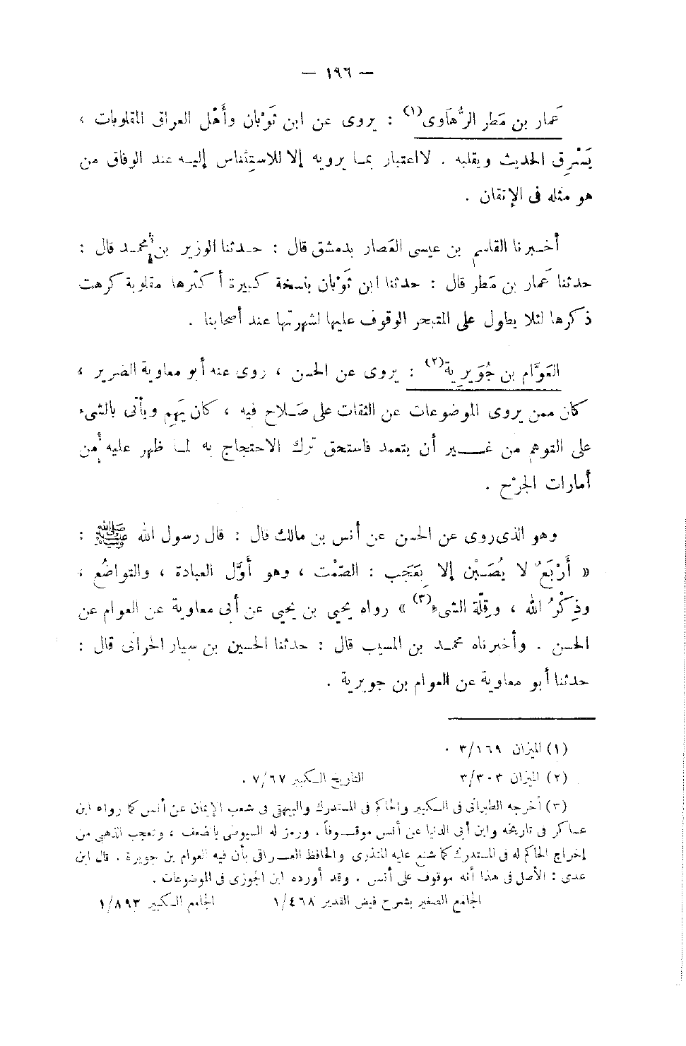 843 - الْعَوام بن جوَيْرِية يروي عَن الْحسن روى عَنْهُ أَبُو مُعَاوِيَة الضَّرِير كَانَ مِمَّن يروي الموضوعات عَن الثِّقَات على صَلَاح فِيهِ كَانَ يهم وَيَأْتِي بالشَّيْء على التَّوَهُّم من غير أَن يتَعَمَّد فَاسْتحقَّ ترك الِاحْتِجَاج بِهِ لما ظهر عَلَيْهِ من أَمَارَات الْجرْح وَهُوَ الَّذِي رَوَى عَنِ الْحَسَنِ عَنْ أَنَسِ بْنِ مَالِكٍ قَالَ قَالَ رَسُولُ اللَّهِ صَلَّى اللَّهُ عَلَيْهِ وَسَلَّمَ أَرْبَعٌ لَا يُصِبْنَ إِلا بِعَجَبٍ الصَّمْتُ وَهُوَ أَوَّلُ الْعِبَادَةِ وَالتَّوَاضُعُ وَذِكْرُ اللَّهِ وَقِلَّةُ الشَّيْءِ رَوَاهُ يَحْيَى بْنُ يَحْيَى عَنْ أَبِي مُعَاوِيَةَ عَنِ الْعَوَامِ عَنِ الْحَسَنِ وَأَخْبَرَنَاهُ مُحَمَّدُ بْنُ الْمُسَيِّبِ قَالَ حَدَّثَنَا الْحُسَيْنُ بْنُ سَيَّارٍ الْحَرَّانِيُّ قَالَ حَدَّثَنَا أَبُو مُعَاوِيَةَ عَن الْعَوام بن جوَيْرِية