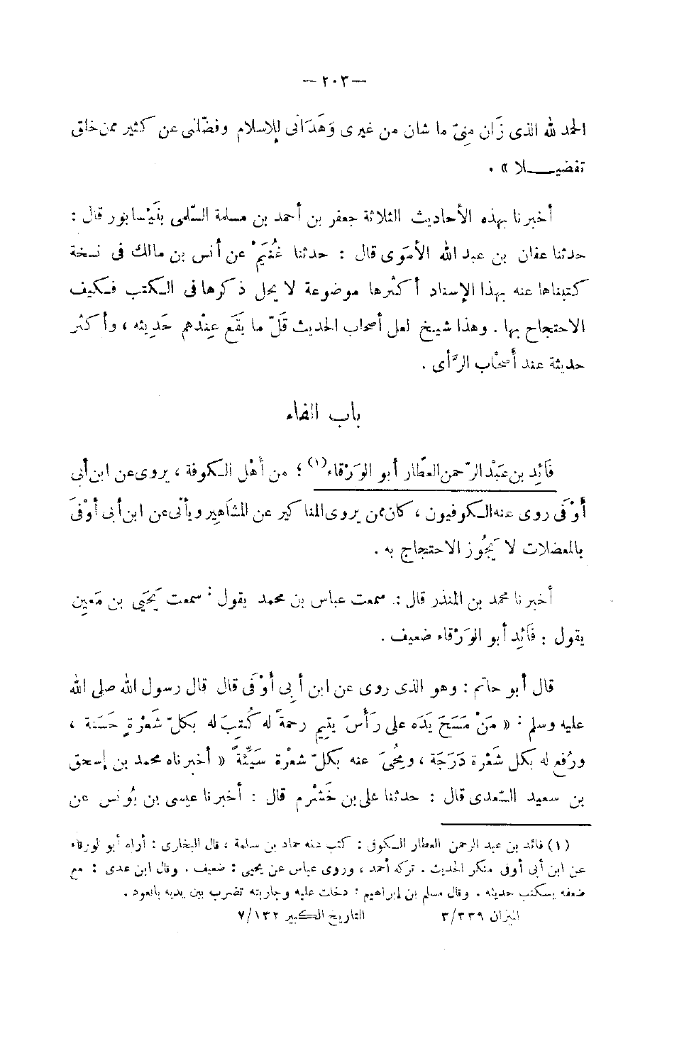 الْحَمْدُ لِلَّهِ الَّذِي زَانَ مِنِّي مَا شان من غير وَهَدَانِي لِلإِسْلامِ وَفَضَّلَنِي عَنْ كَثِيرٍ مِمَّنْ خَلَقَ تَفْضِيلا أخبرنَا بِهَذِهِ الْأَحَادِيث الثَّلَاثَة جَعْفَر بن أَحْمد بن مسلمة السّلمِيّ بنيسابور قَالَ حَدَّثَنَا عُثْمَانُ بْنُ عَبْدِ اللَّهِ الْأمَوِي قَالَ حَدثنَا غنيم عَن أَنَسِ بْنِ مَالِك فِي نُسْخَةٍ كَتَبْنَاهَا عَنْهُ بِهَذَا الإِسْنَادِ أَكْثَرُهَا مَوْضُوعَة لَا يحل ذكرهَا فِي الْكتب فَكيف الِاحْتِجَاج بهَا وَهَذَا شيخ لَعَلَّ أَصْحَاب الحَدِيث قل مَا يَقع عِنْدهم حَدِيثه وَأكْثر حَدِيثه عِنْد أَصْحَاب الرَّأْي