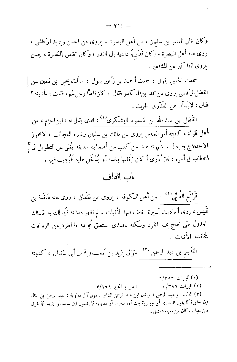 وَكَانَ خَال الْمُعْتَمِر بن سُلَيْمَان من أهل الْبَصْرَة يروي عَن الْحسن وَيزِيد الرقاشِي روى عَنهُ أهل الْبَصْرَة وَكَانَ قدريا دَاعِيَة إِلَى الْقدر وَكَانَ يقص بِالْبَصْرَةِ مِمَّن يَرْوِي الْمَنَاكِير عَن الْمَشَاهِير سَمِعْتُ الْحَنْبَلِيَّ يَقُولُ سَمِعْتُ أَحْمَدَ بْنَ زُهَيْرٍ يَقُولُ سَأَلْتُ يَحْيَى بن معِين عَن الْفضل الرقاشِي يروي عَن مُحَمَّد بْن الْمُنْكَدر فَقَالَ كَانَ قَاصا رجل سوء فَقلت فَحَدِيثه فَقَالَ لَا يسْأَل عَن القدري الْخَبيث