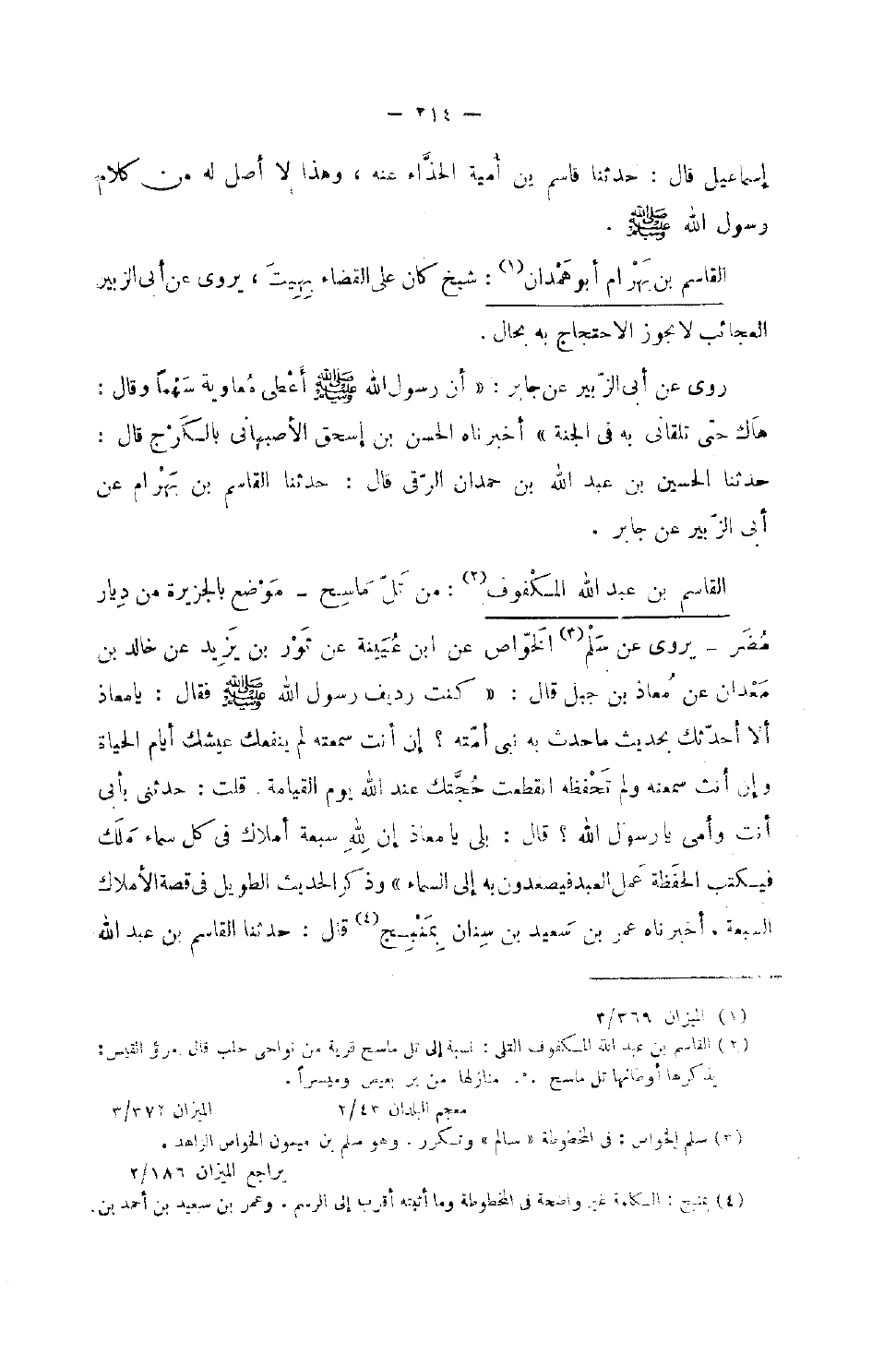 882 - الْقَاسِم بن بهْرَام أَبُو هَمدَان شيخ كَانَ على الْقَضَاء بهيت يروي عَن أبي الزبير الْعَجَائِب لَا يَجُوز الِاحْتِجَاج بِهِ بِحَال رَوَى عَنْ أَبِي الزُّبَيْرِ عَنْ جَابِرٍ أَنَّ رَسُولَ اللَّهِ صَلَّى اللَّهُ عَلَيْهِ وَسَلَّمَ أَعْطَى مُعَاوِيَةَ سَهْمًا وَقَالَ هَاكَ حَتَّى تَلْقَانِي بِهِ فِي الْجَنَّةِ أَخْبَرَنَاهُ الْحُسَيْنُ بْنُ إِسْحَاقَ الأَصْبَهَانِيُّ بِالْكَرْخِ قَالَ حَدَّثَنَا الْحُسَيْن بن عبد الله بن حَمْدَانَ الرَّقِّيُّ قَالَ حَدَّثَنَا الْقَاسِمُ بْنُ بَهْرَامَ عَنْ أَبِي الزُّبَيْرِ عَن جَابر